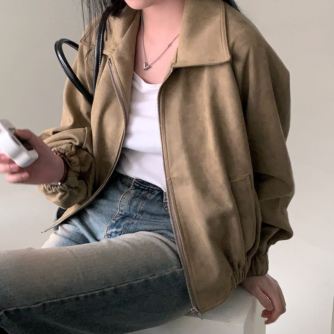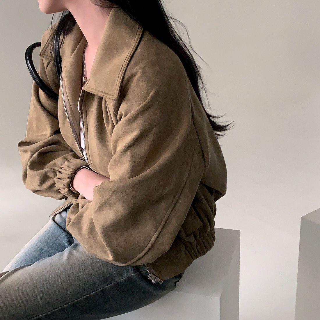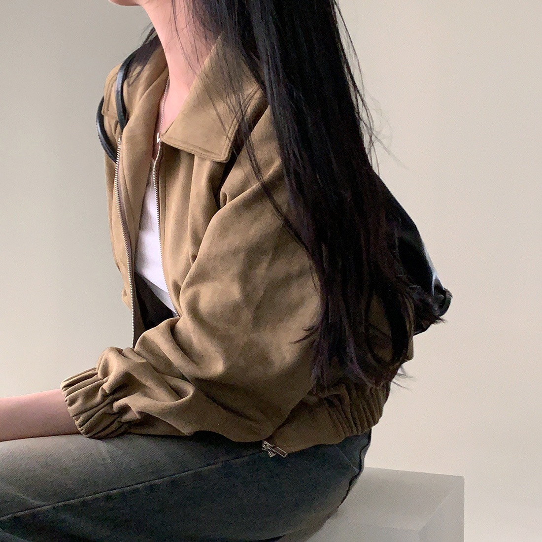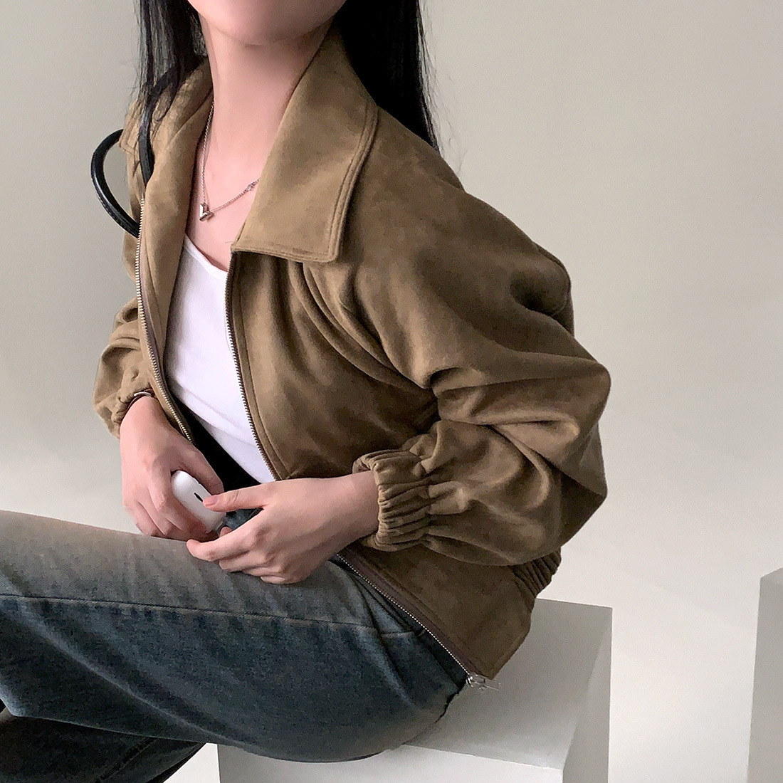 Корейская chic осень французская ретро-молния с молнией с воротником