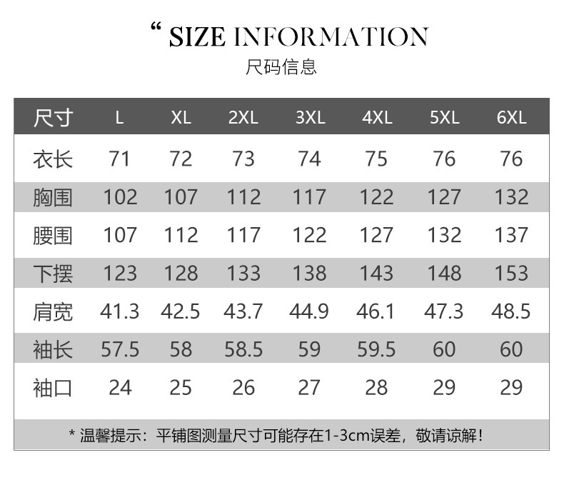 L (рекомендуется 50-80kg); XL (рекомендуется 50-80kg); 2XL (рекомендуется 50-80kg); 3XL (рекомендуется 80-100kg); 4XL (рекомендуется 80-100kg); 5XL (рекомендуется 100-120kg); 6XL (рекомендуется 100-120kg)