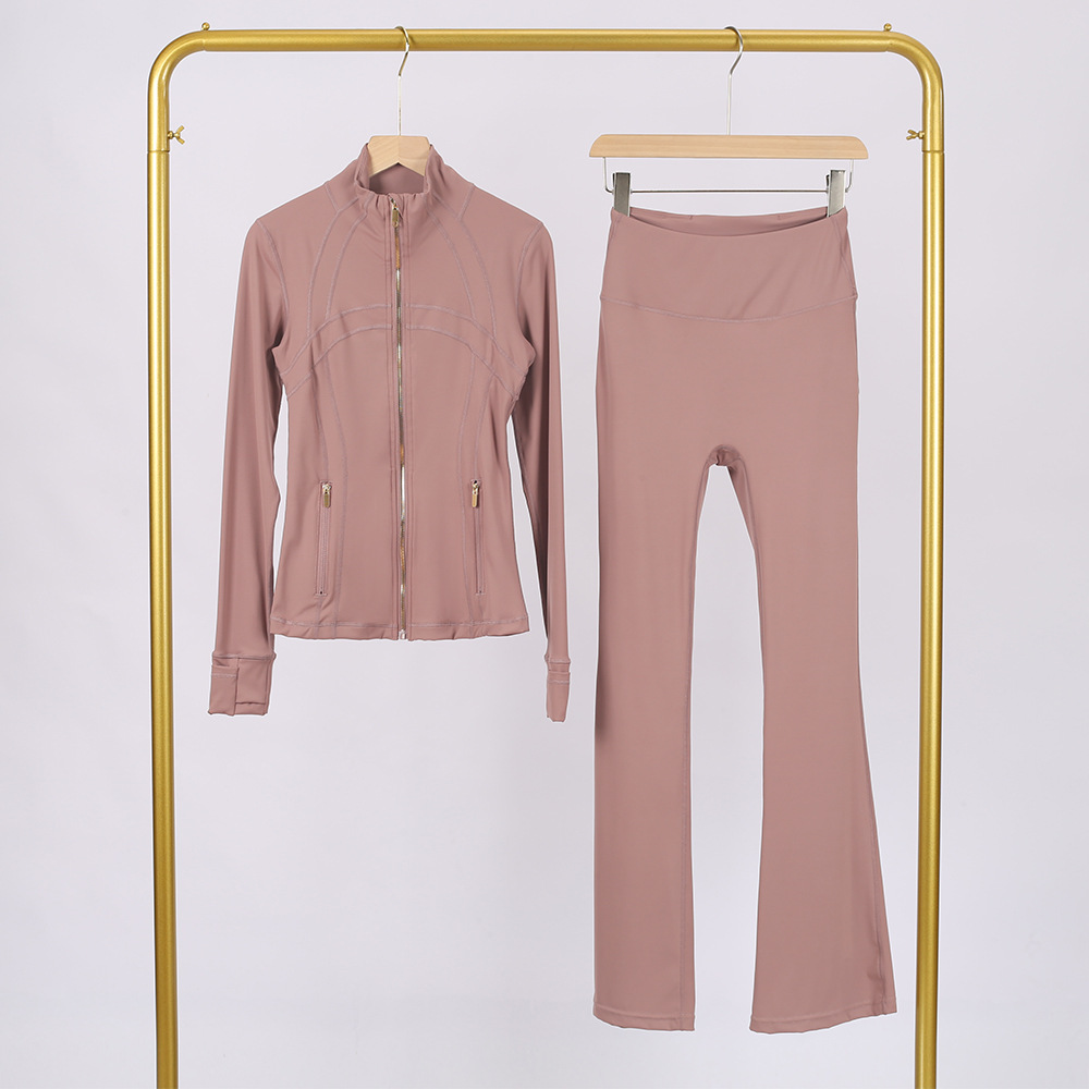 Комплект LULU DF: куртка с воротником-стойкой и брюки-клеш, топ с золотой молнией, женская приталенная куртка, эластичная одежда для йоги для женщин