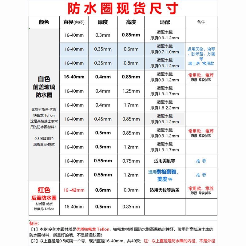 注意:尺寸选项里标注的是【防水圈的内径】请测量核对好哦!表镜直径多大 就拍多大直径的防水圈,但是还需要考虑圈的厚度和高度!尤其是圈的厚度选 厚了或薄了都不合适!需要游标卡尺测量,不能用直尺卷尺米尺,不准确会买错!
