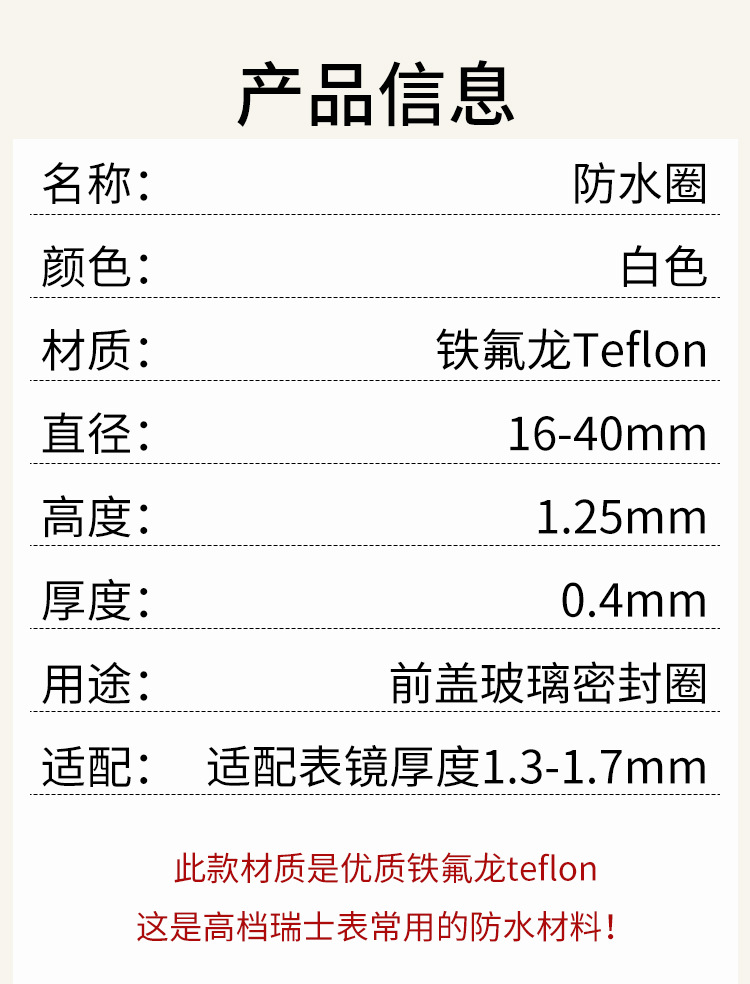 这款是优质铁氟龙材质的防水圈(I-ring),不是普通便宜的塑胶圈材质哦,瑞士表常用的就是这种铁氟龙材质防水圈,密封性好、耐温、稳定、质量好。