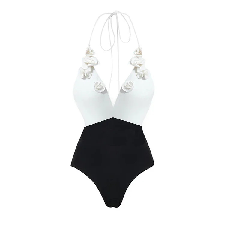 Черно-белый цвет темно-V купальник бикини женский шейный цветок купальник высокого уровня сексуальный европейский купальник с открытой спиной