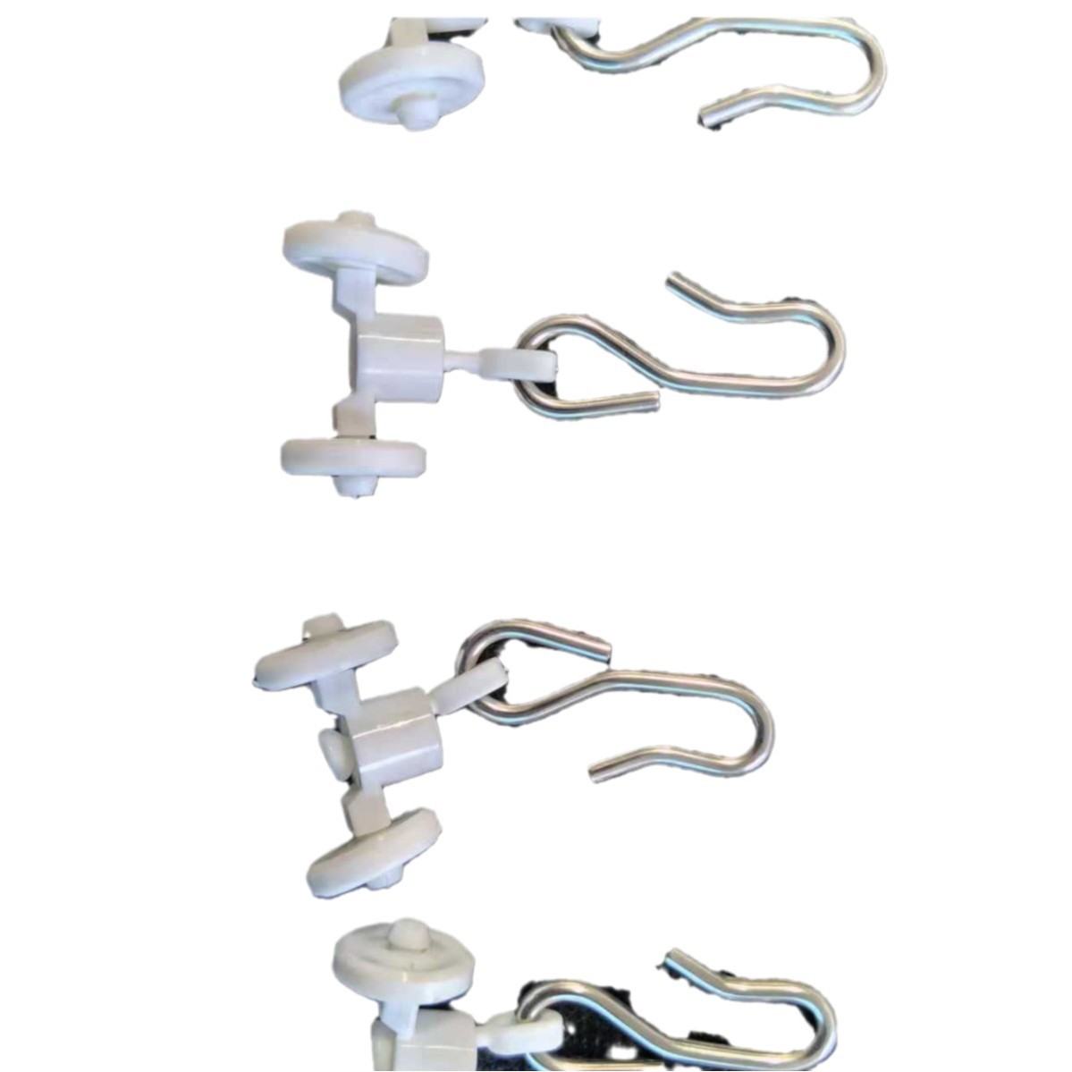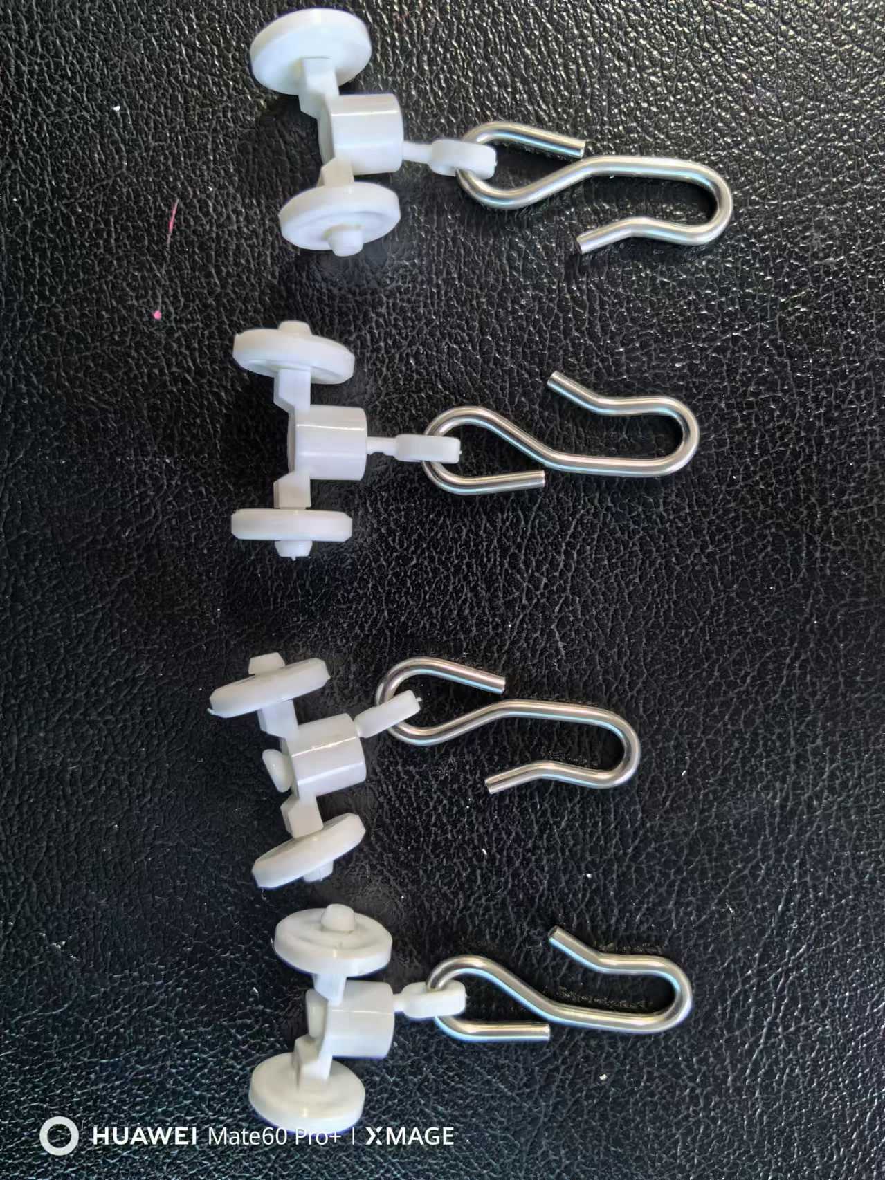 这是窗帘轨道滑轮挂钩,属于窗帘配件,白材质为PP且可转动,挂钩部分是201不锈钢,有“卡扣高低轮”等称呼 ,可用于阳台等场景的窗帘轨道,作为辅料适配直轨、弯轨等,有厂家专业生产、批发