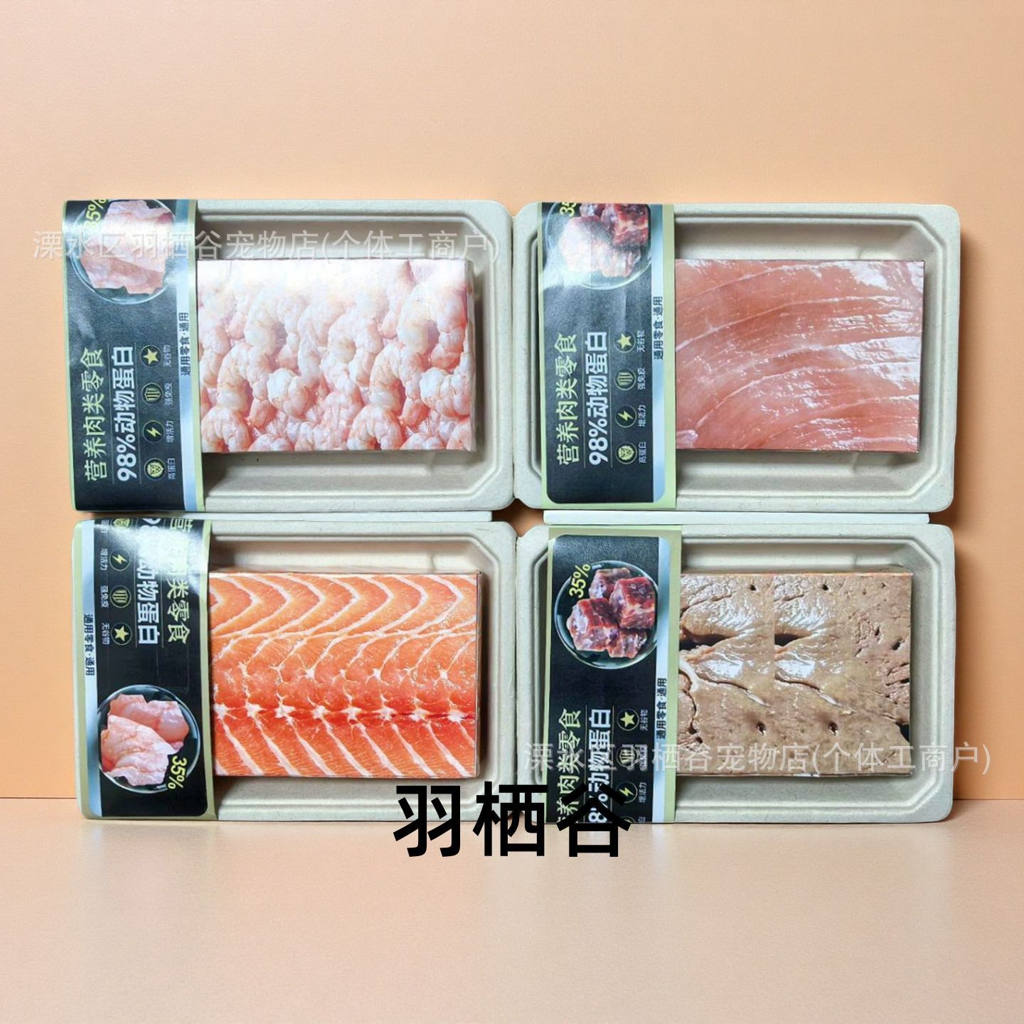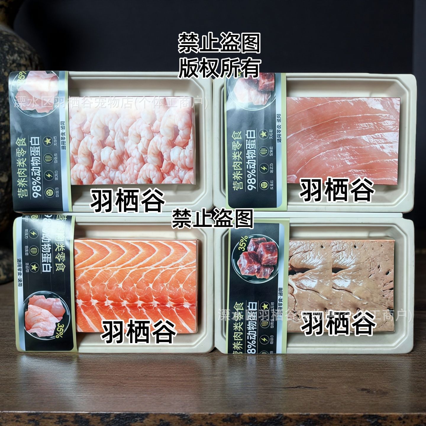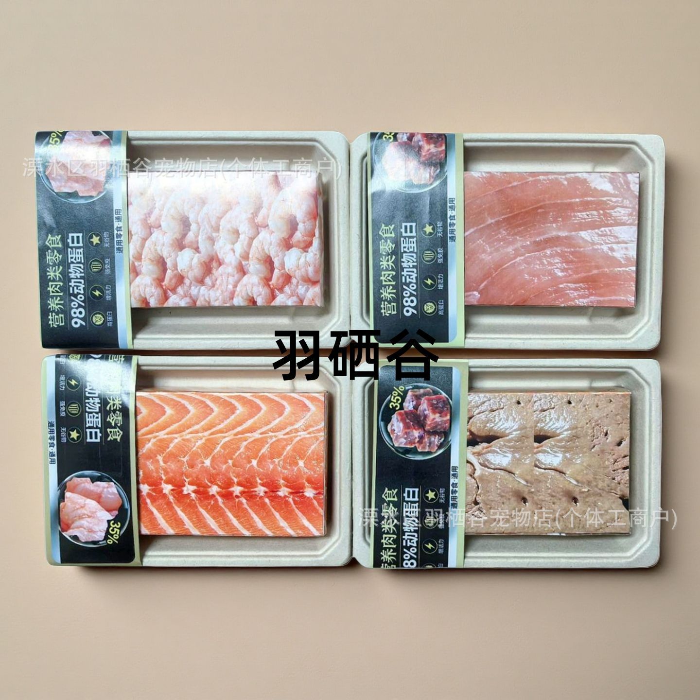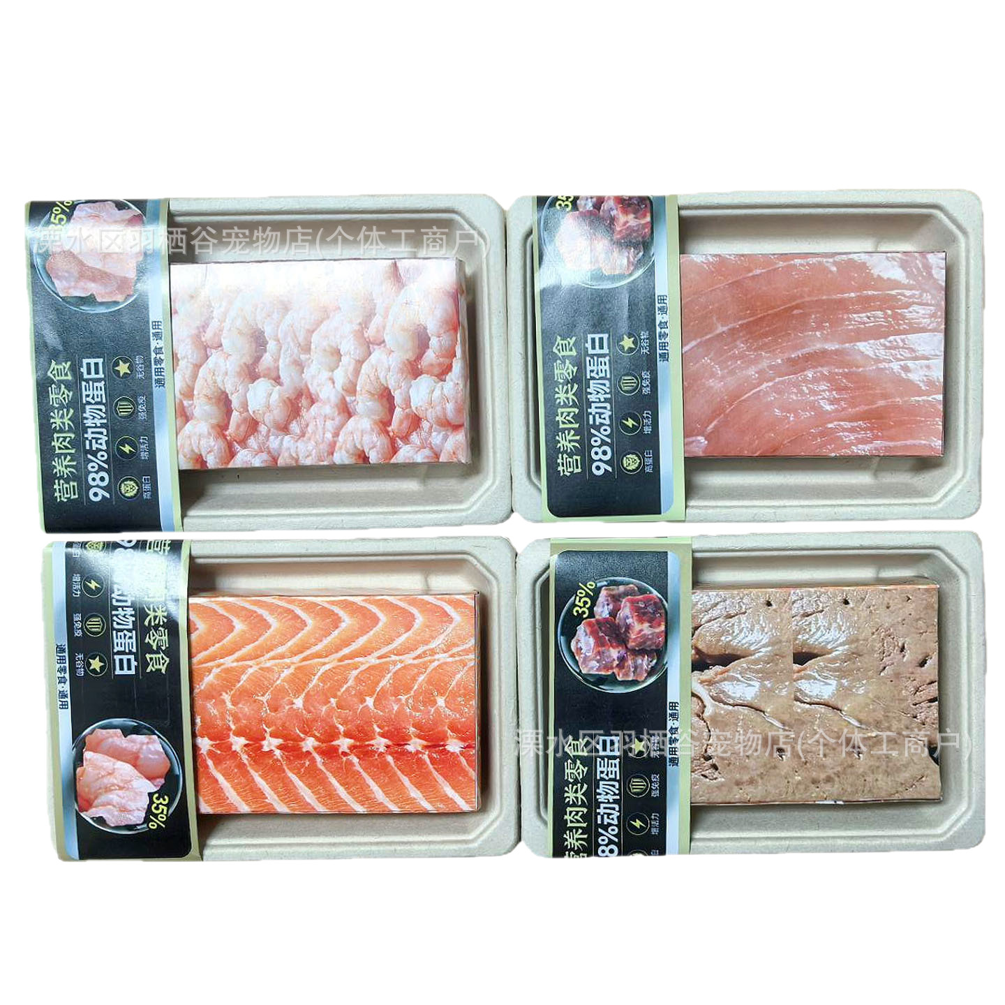 Коробка с рисунком из бумаги, изображающим свежего лосося; Коробка свежей печени, завернутой в бумагу; Коробка свежих куриных грудок в бумажной упаковке; Коробка бумажных креветок