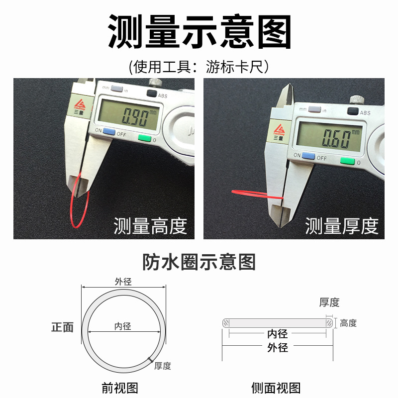 注意:尺寸选项里标注的是【防水圈的内径】请测量核对好哦!表镜直径多大 就拍多大直径的防水圈,但是还需要考虑圈的厚度和高度!尤其是圈的厚度选 厚了或薄了都不合适!需要游标卡尺测量,不能用直尺卷尺米尺,不准确会买错!