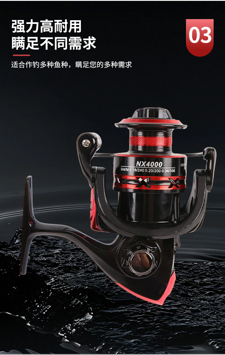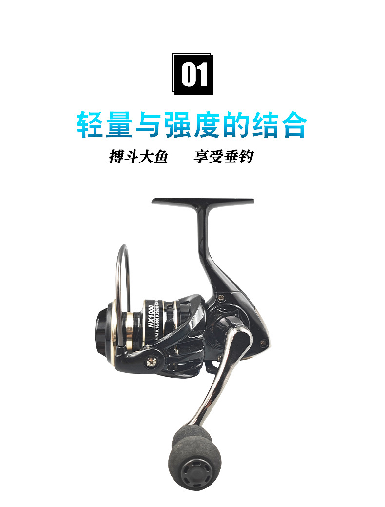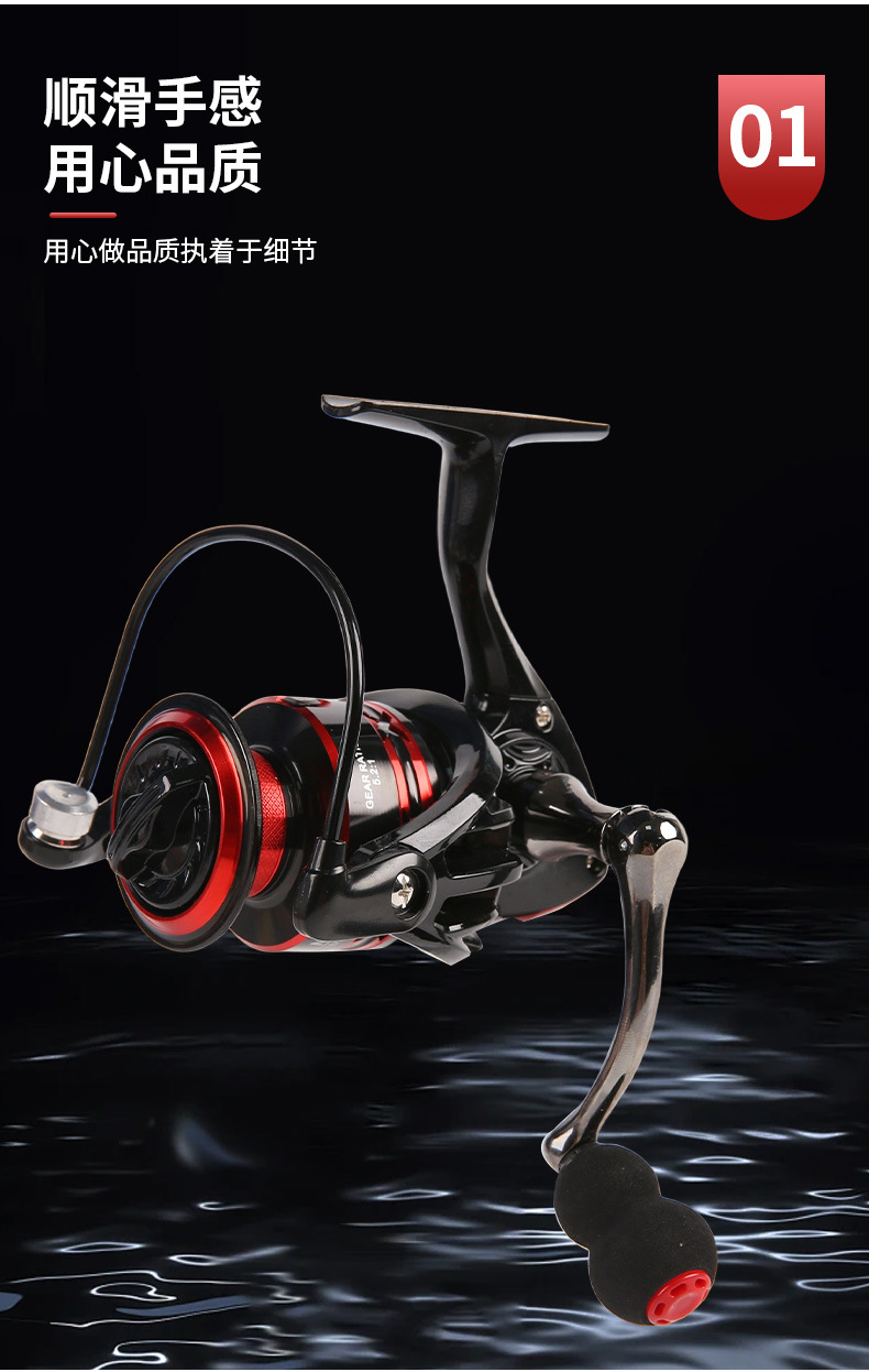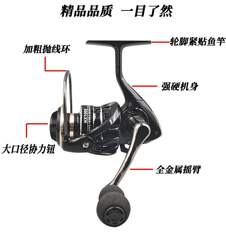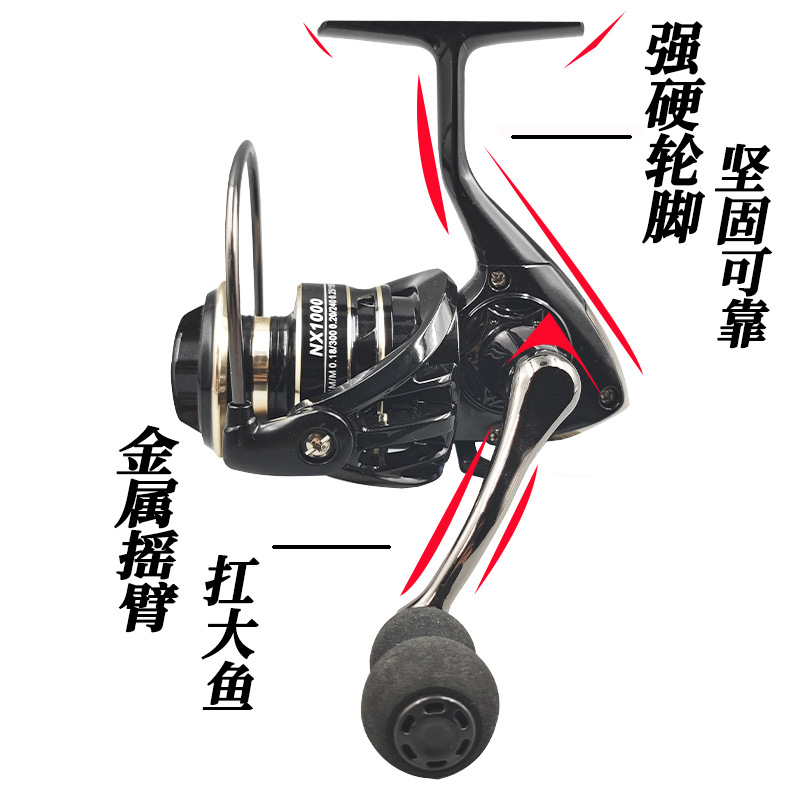 产品特点:弧形轮座,坚固耐用;加粗抛线环,阻力小,出现快;合金线杯,硬拽不伤线。