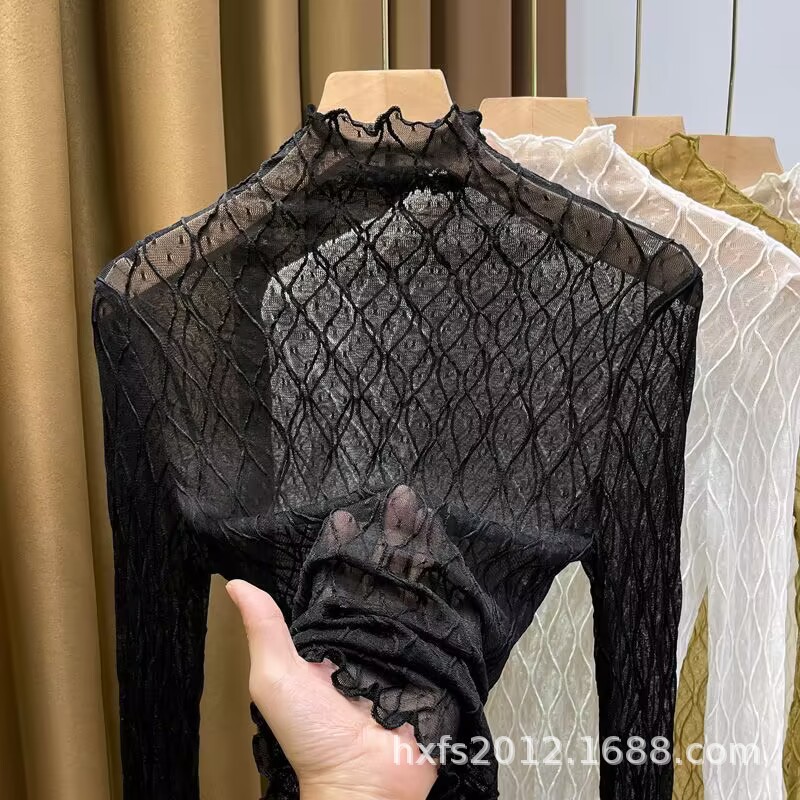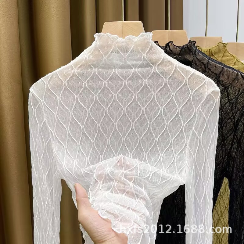 Кружевная рубашка с высоким воротником, маленькая рубашка, женская осень-зима 2024 новая иностранная тонкая марля, белая сетка, нижняя рубашка с длинными рукавами