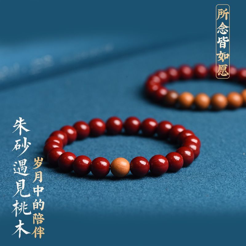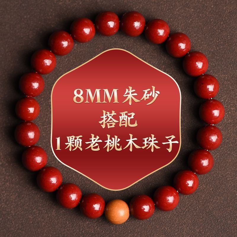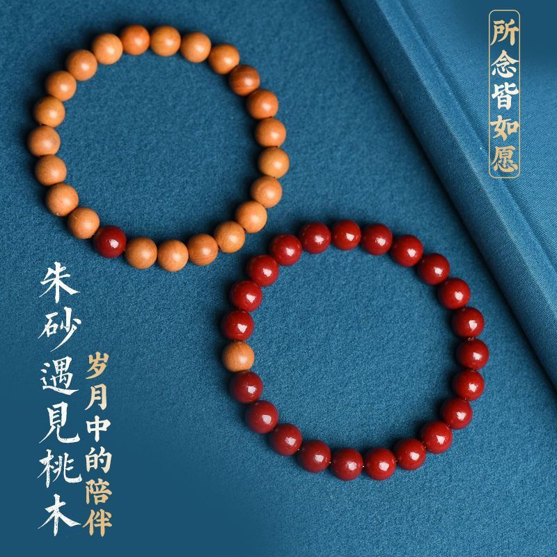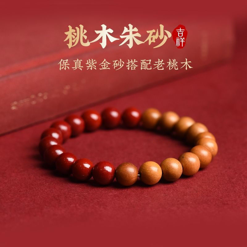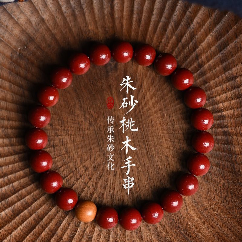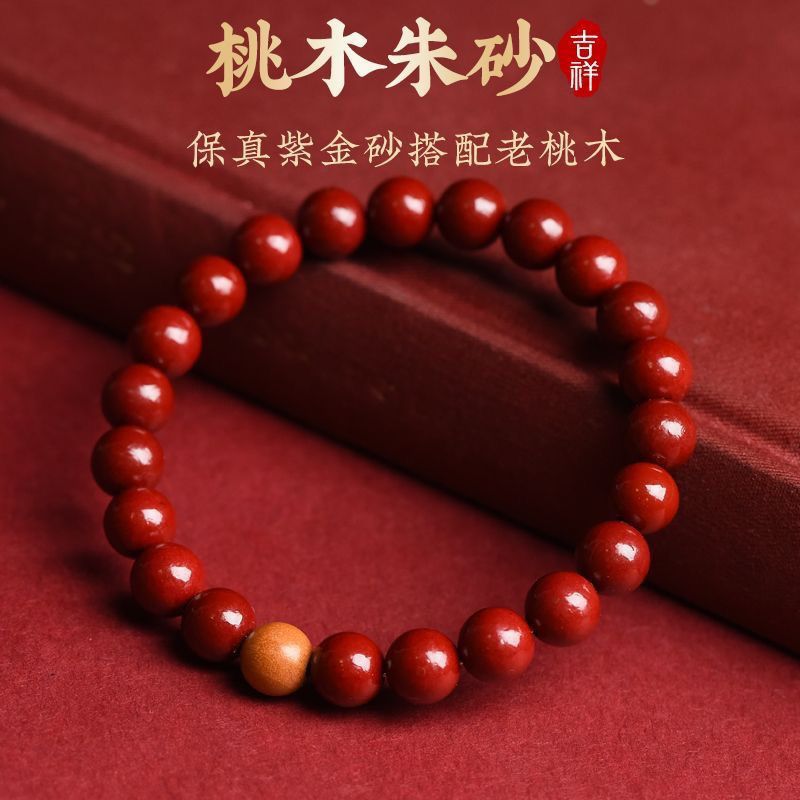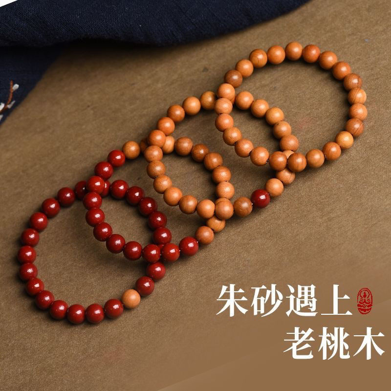 Старинный браслет из персикового дерева с 1 кусочком киновари.; Киноварь в сочетании со старым браслетом из персикового дерева.; [Половина персикового дерева + половина киновари]; [Шашлыки из персикового дерева]