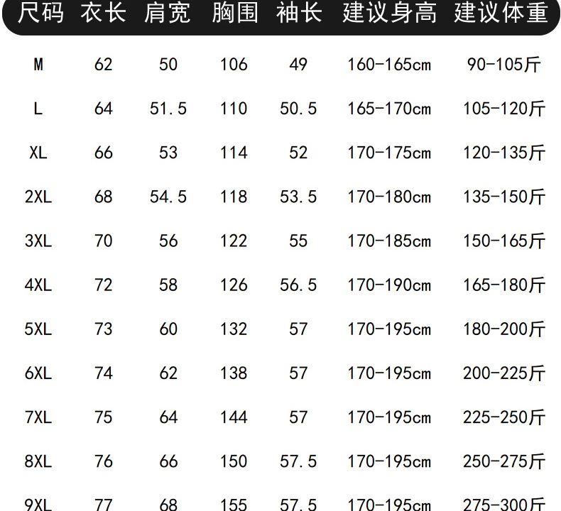 M; L; XL; 2XL; 3XL; 4XL; 5XL; 6XL; 7XL; 8XL; 9XL