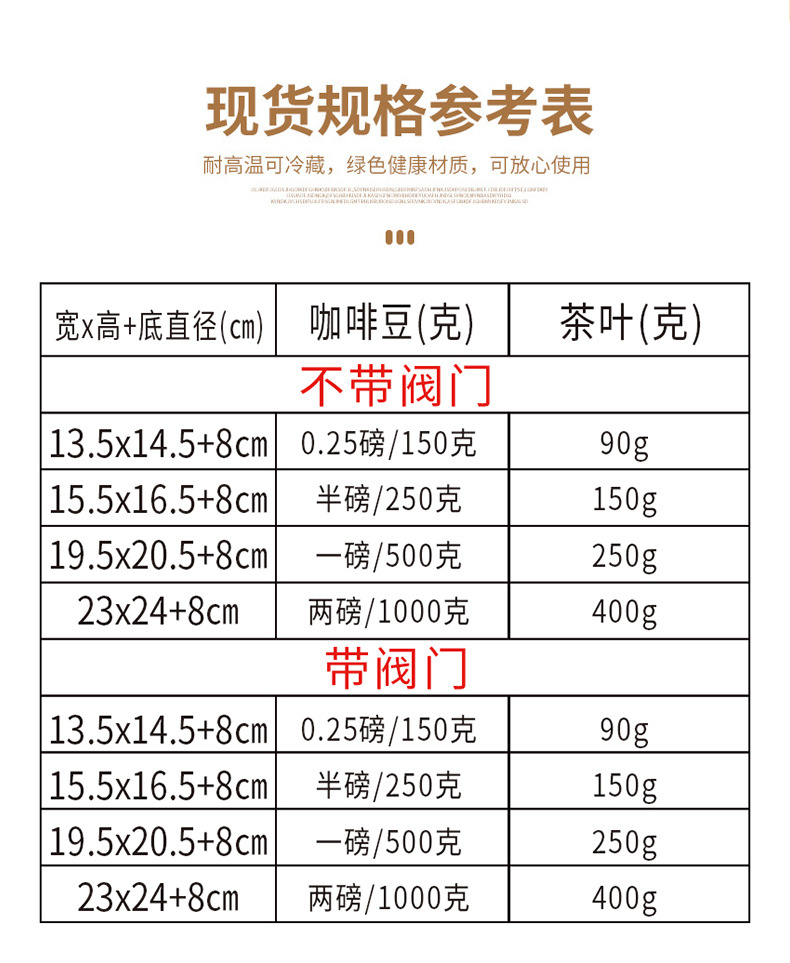 19.5*20.5+8(500g); 15.5*16.5+8(250g); 13.5*14.5*8(125g); 23*24+10(1000g)