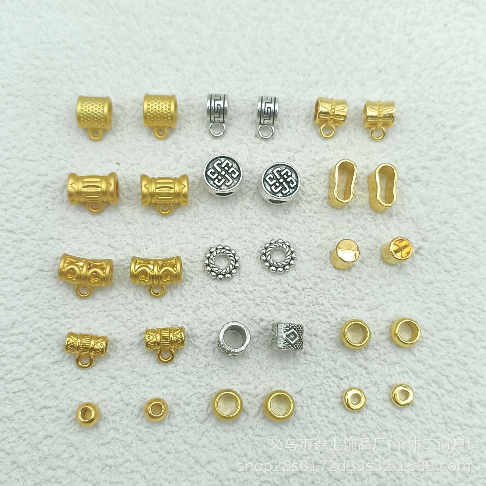 Полый тройник (покрытие стойки); Маленькая футболка (имитация золота); Тройник с большими отверстиями (имитация золота); Бусины 6 см (подвесные); Бусины 6 см (имитация золота); Бусины 5 см (подвесные); Бусины 5 см (имитация золота); Классический стиль (покрытие стойки); Тибетские серебряные бусины-разделители; Тибетская серебряная прокладка; Тибетская серебряная футболка; Тибетские серебряные бусины-ведра; Тройник с длинным стволом (покрытие стойки); Регулировочная пряжка; блок; проставка 5 см