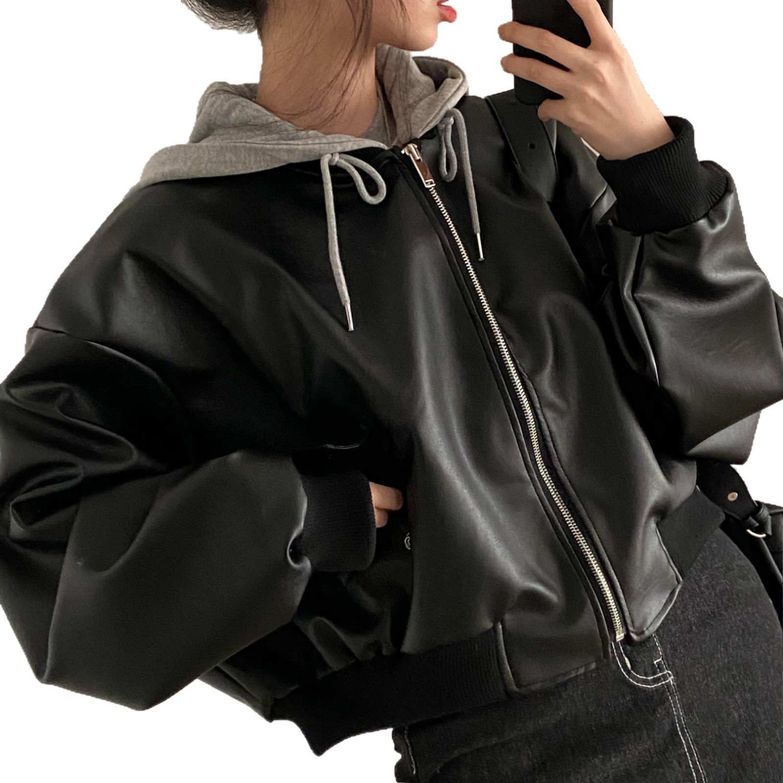 Корейская chic осень-зима нишевые ретро-молнии двойной карманы повседневные свободные дикие поддельные две кожаные куртки с капюшоном