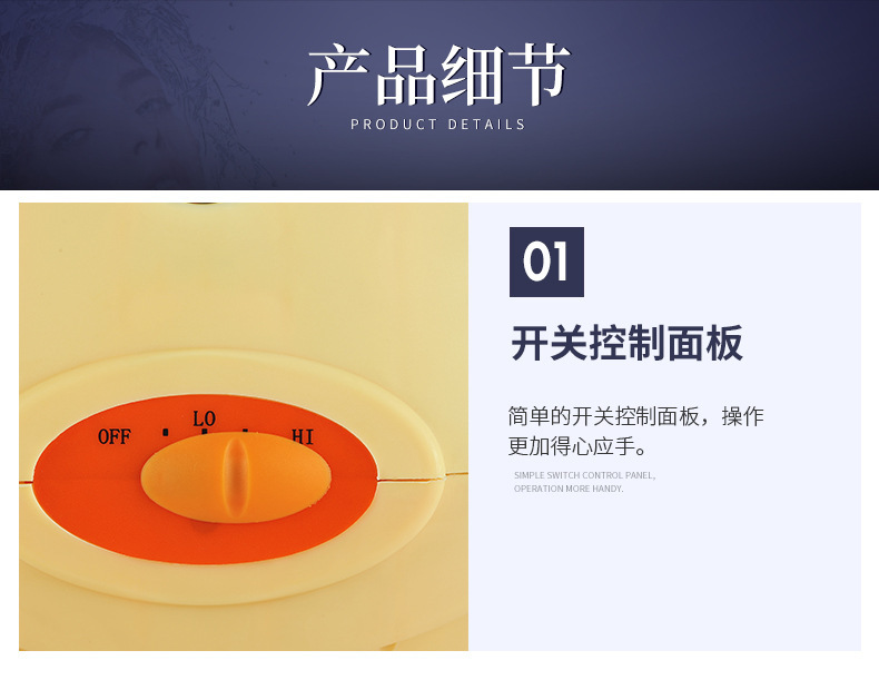 外壳材料:耐温PP塑料开关结构:三层档位加热