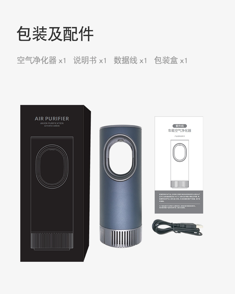 ▲包装及配件:彩盒、空气净化器、Type USB数据线、说明书