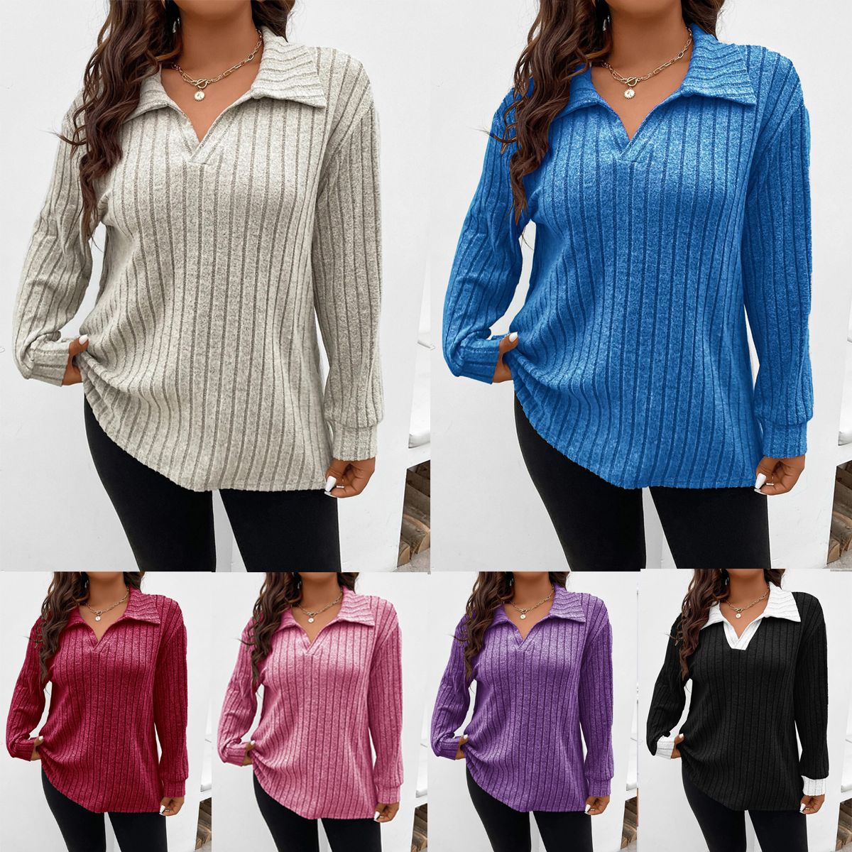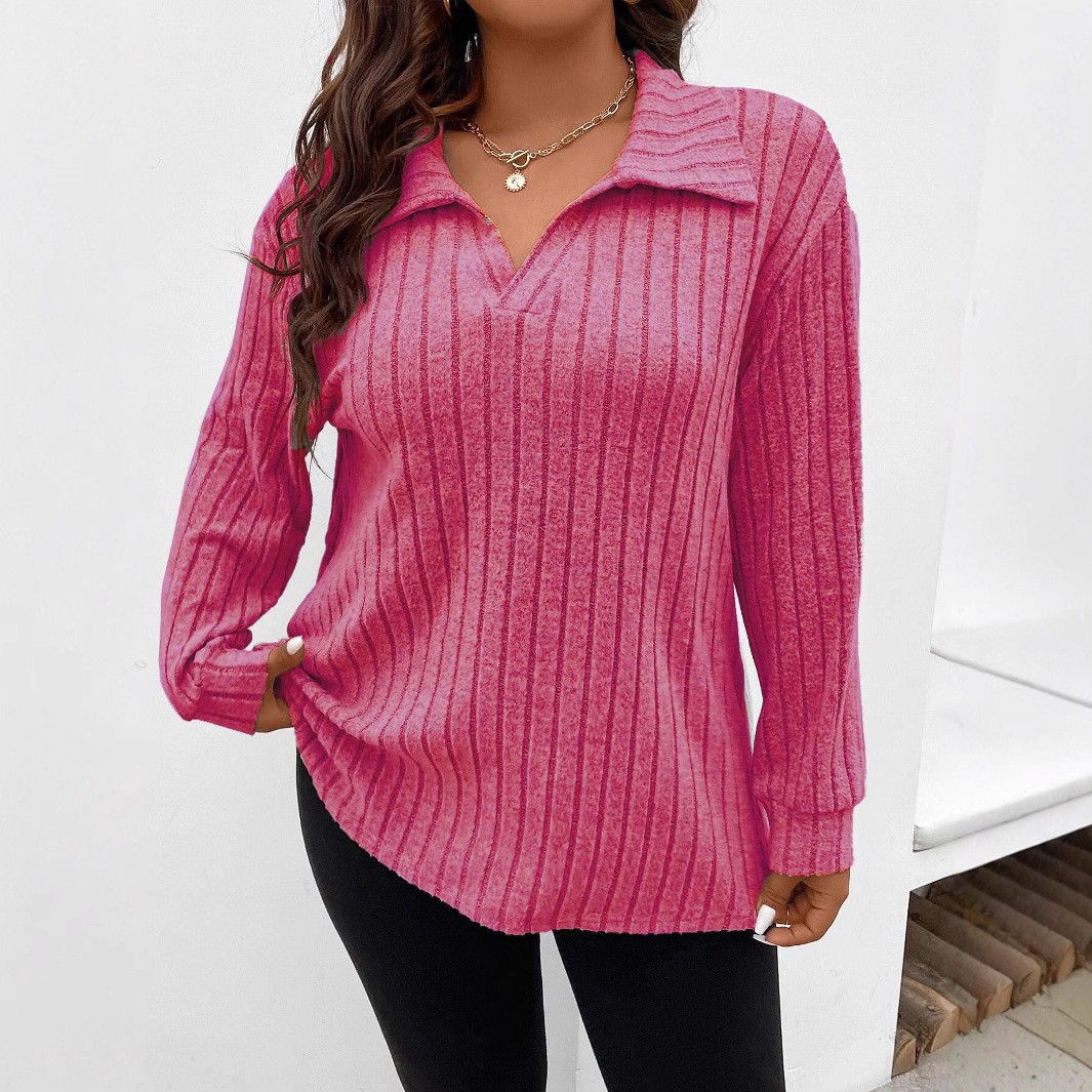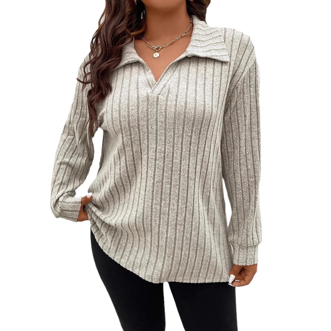 Amazon, осень и зима 202, новые свободные однотонные женские топы больших размеров, v-образные лацканы, футболка с длинными рукавами и полосками, матовая футболка