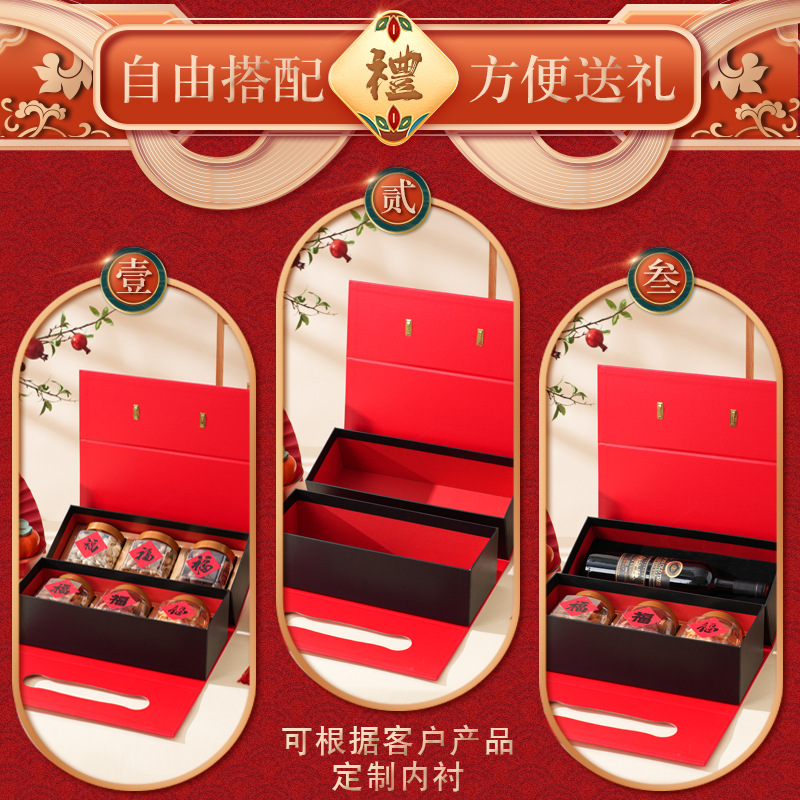本店所有新年礼盒,不带里面的红酒和坚果空罐,红酒和坚果空罐内衬如果需要订制的请联系客服!!