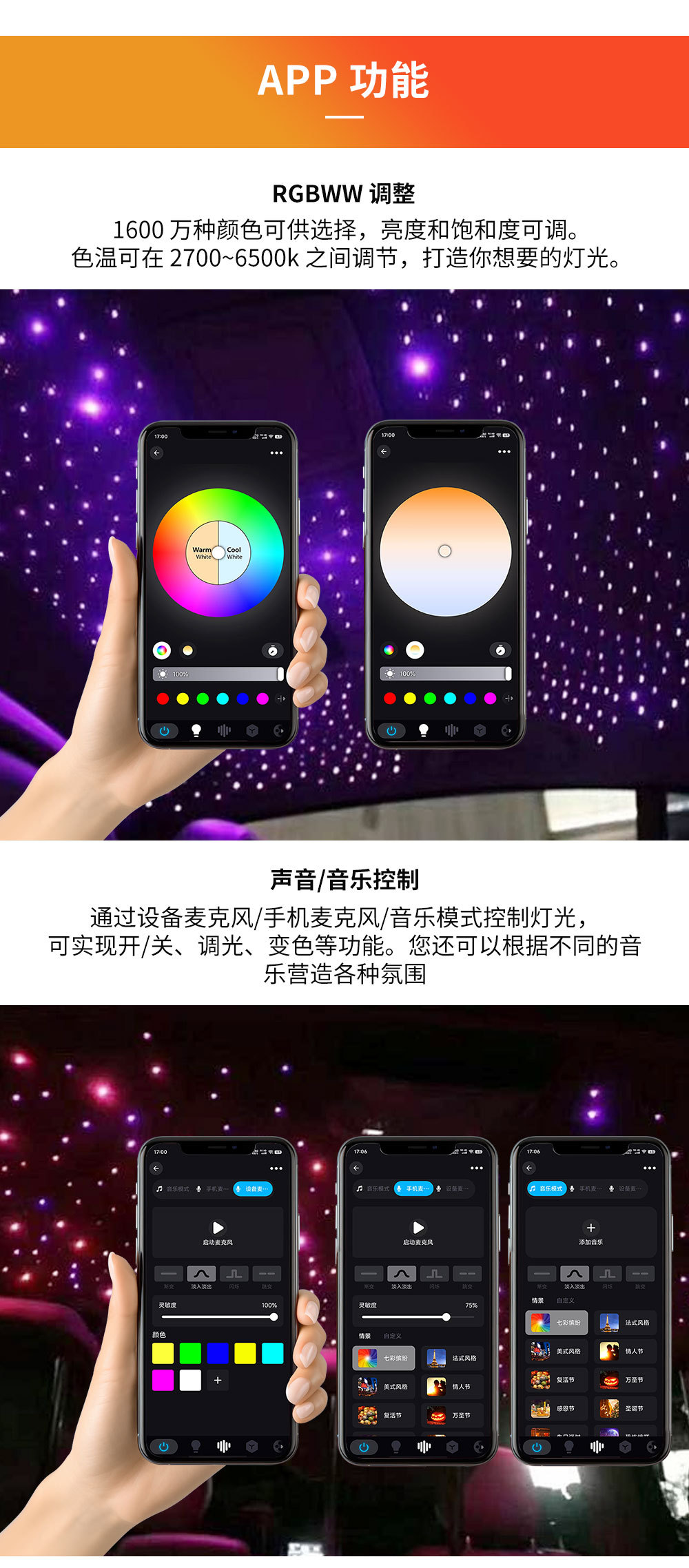 Специальное предложение: 16W RGB+CCT одноголовочный стробоскоп для создания эффекта звездного неба в автомобиле, с управлением через Bluetooth и приложение.