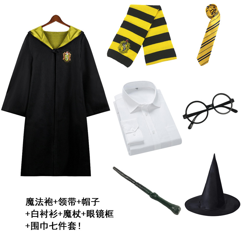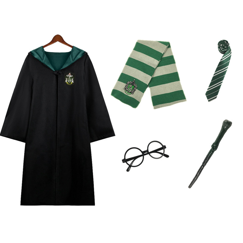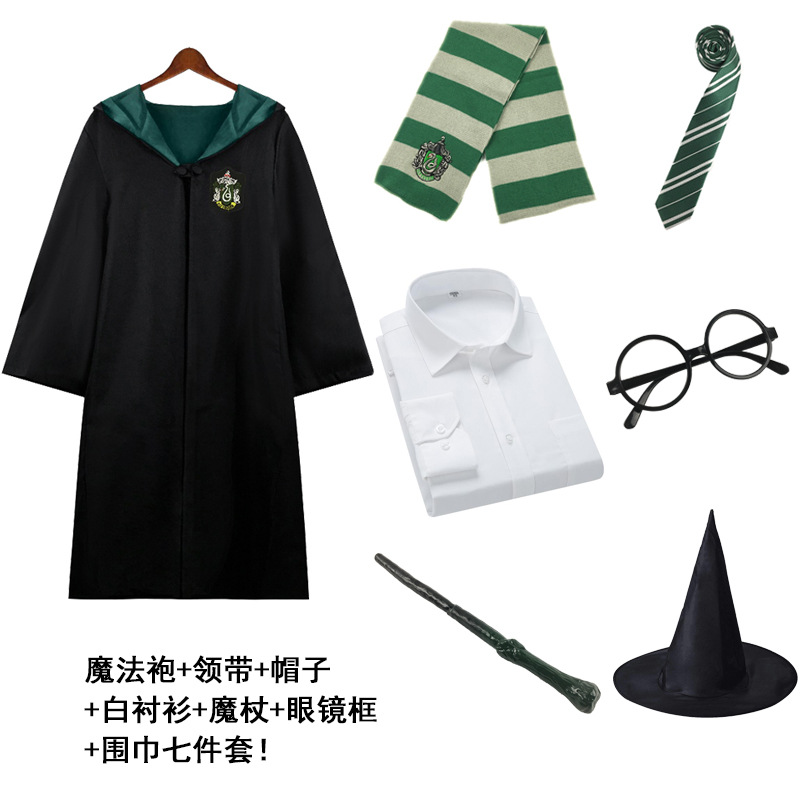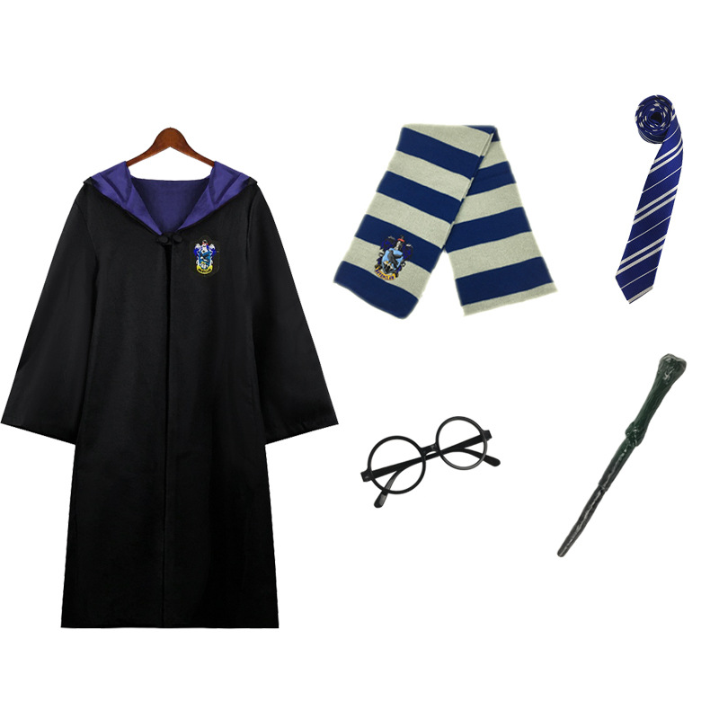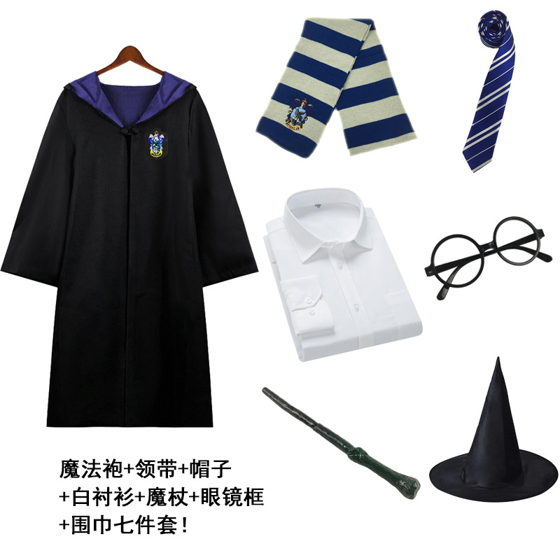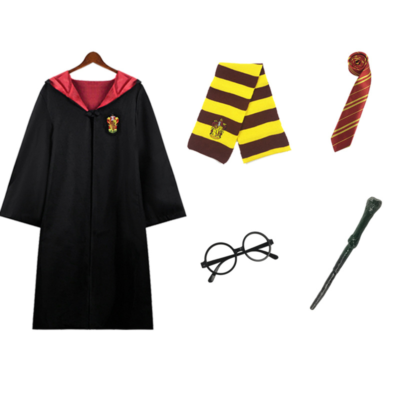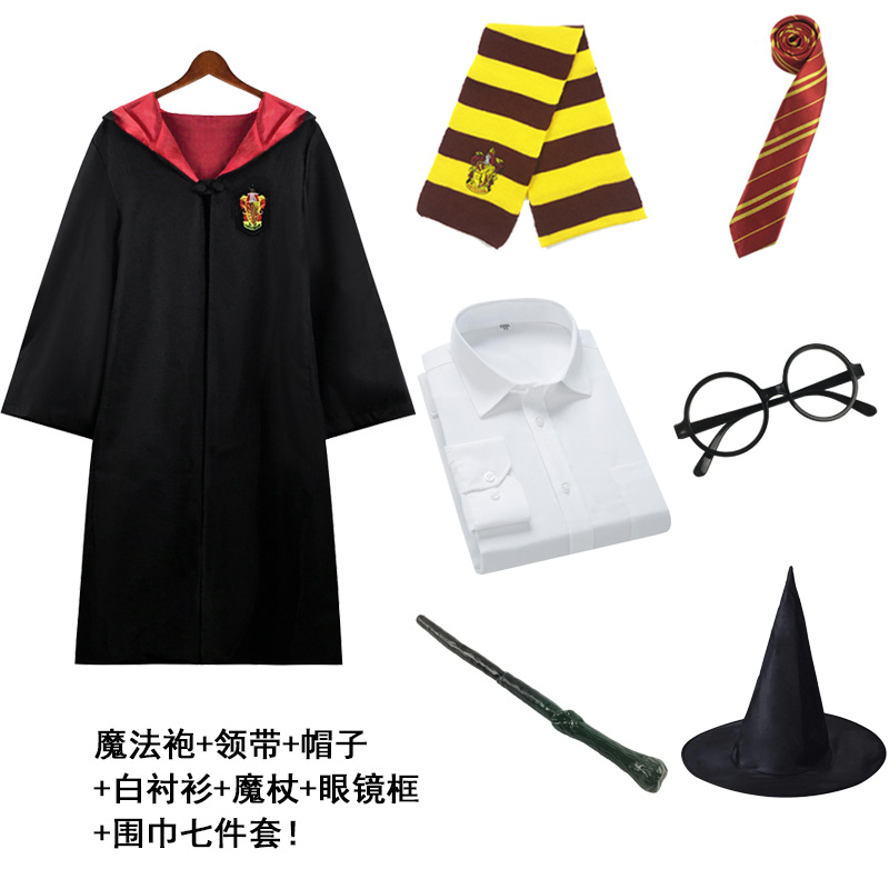 Красный халат Суда Льва; Зеленый халат Snake Yard; Синий халат Eagle Yard; Желтый халат Баджера Ярда; Красный плащ + галстук; Зеленый плащ + галстук; Синий плащ + галстук; Желтый плащ + галстук; Красный плащ + галстук + шарф; Зеленый плащ + галстук + шарф; Синий плащ + галстук + шарф; Желтый плащ + галстук + шарф; Красный плащ + галстук + шарф + очки + палочка; Зеленый плащ + галстук + шарф + очки + палочка; Синий плащ + галстук + шарф + очки + палочка; Желтый плащ + галстук + шарф + очки + палочка; Красный набор из семи предметов.; Зеленый набор из семи предметов.; Синий набор из семи предметов.; Желтый набор из семи предметов.; Красный галстук (примечание для других цветов); Красный шарф (примечания к остальным цветам); очки; волшебная палочка; шляпа; рубашка; юбка; брюки; Красный свитер (примечания к остальным цветам); Ожерелье Золотой Снитч (случайный цвет); Ожерелье Смертных Ключей (случайный цвет); Ожерелье-преобразователь времени (случайный цвет); черный плащ