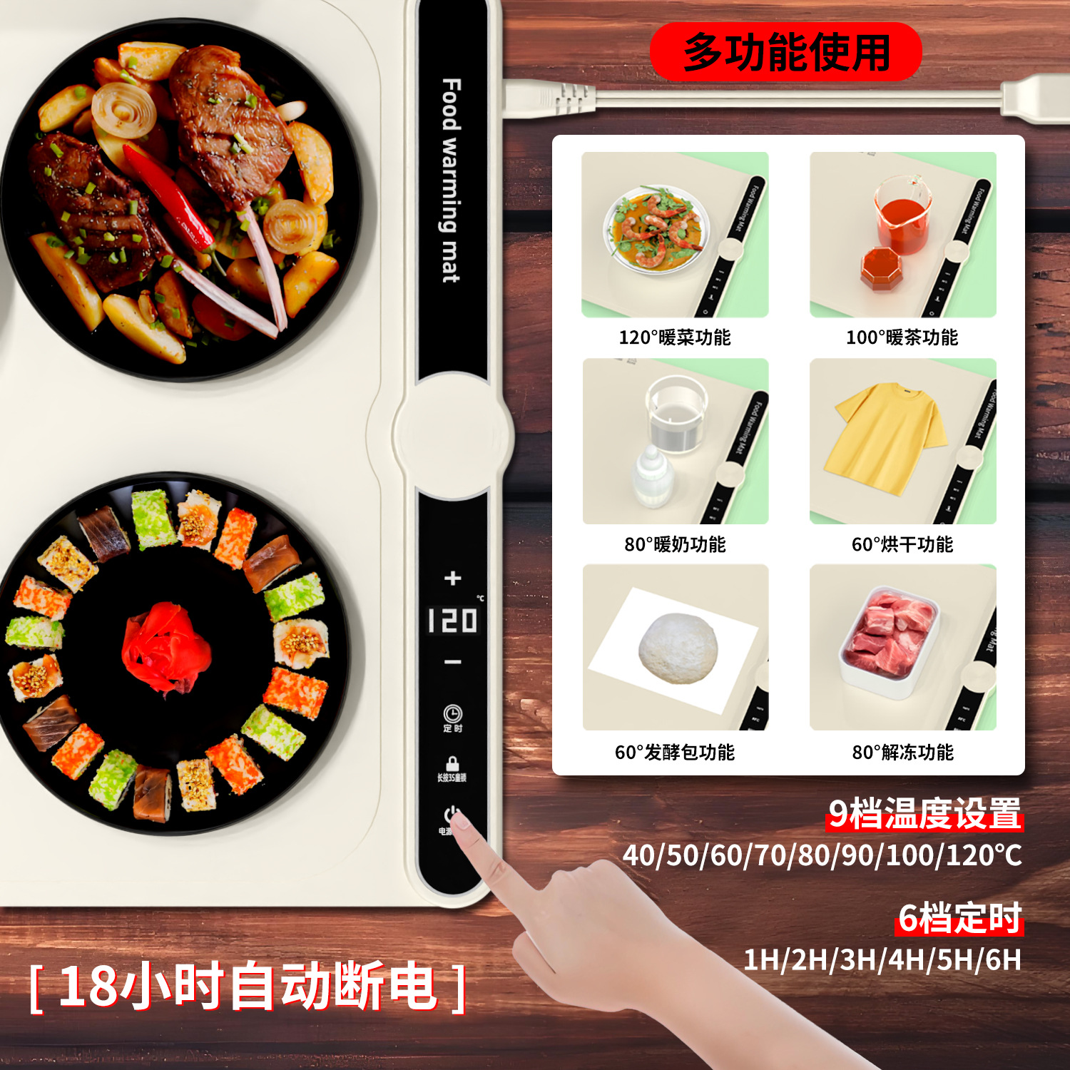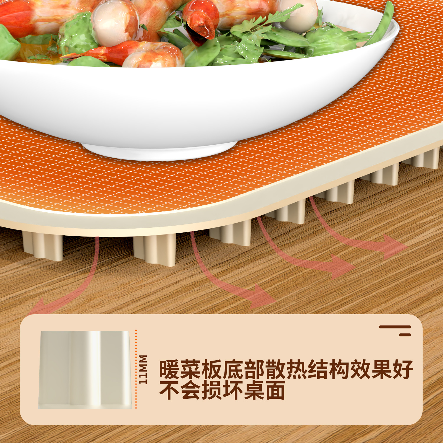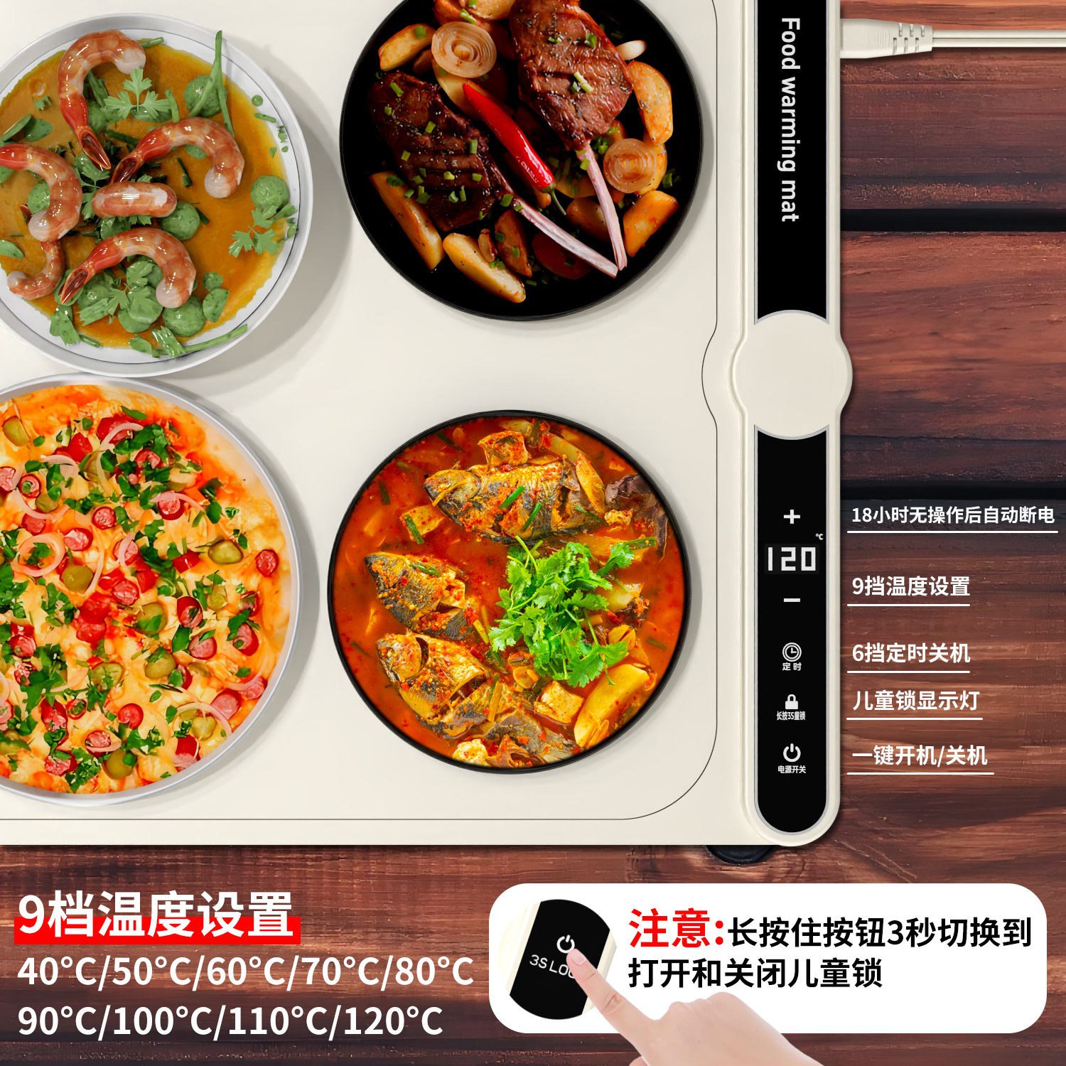 Конструкция с защитой от ожогов, не повреждает стол, не скользит, нагревается без запаха, подходит для различных материалов посуды.