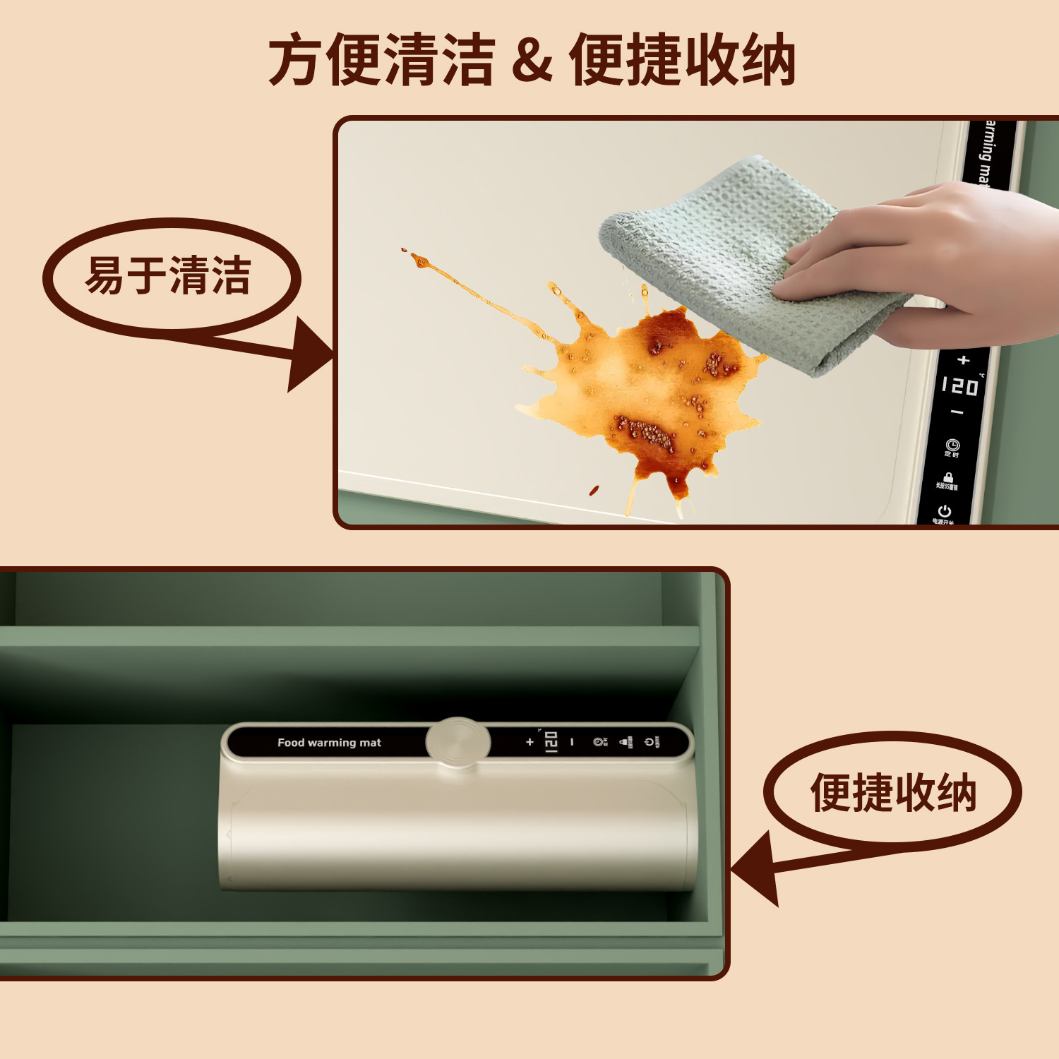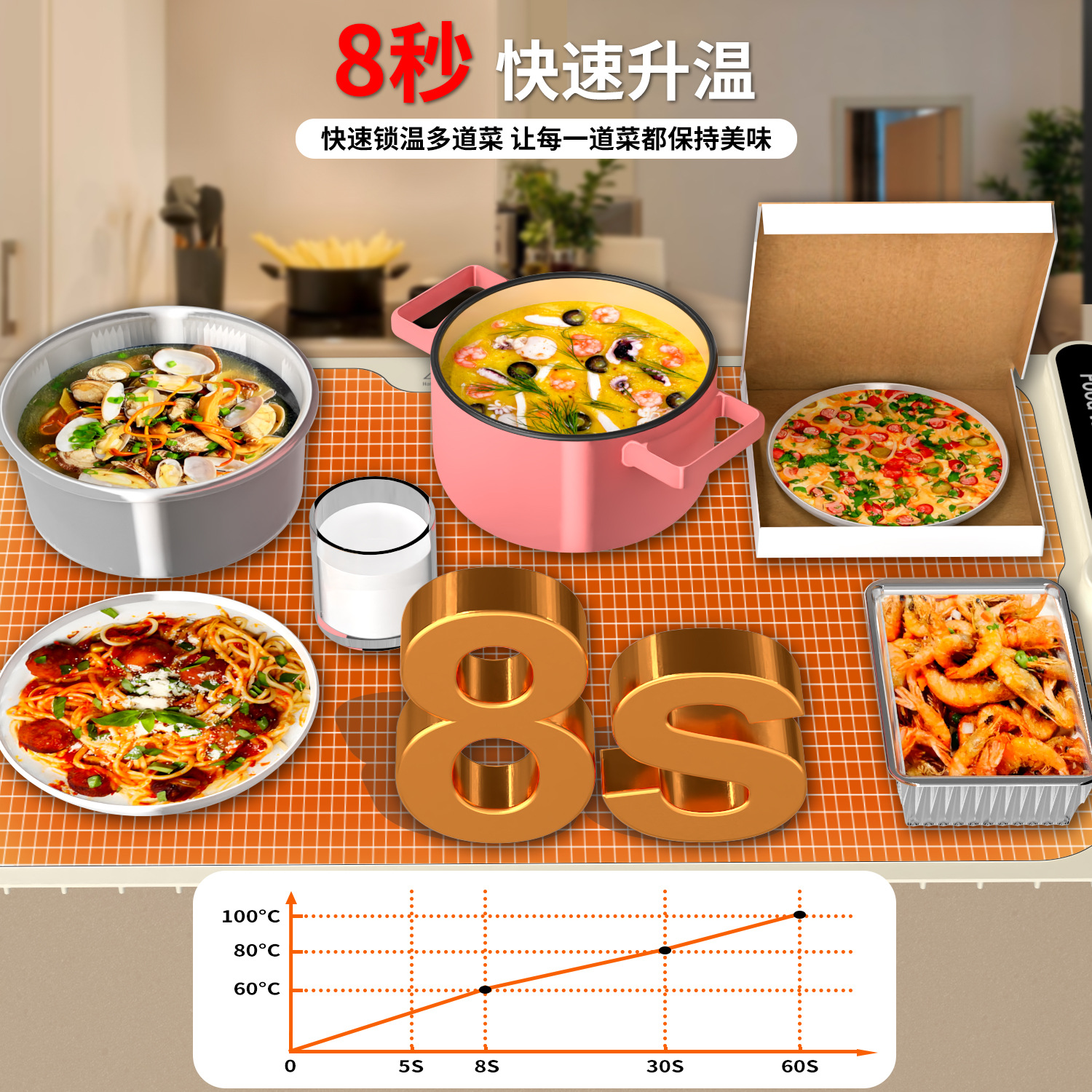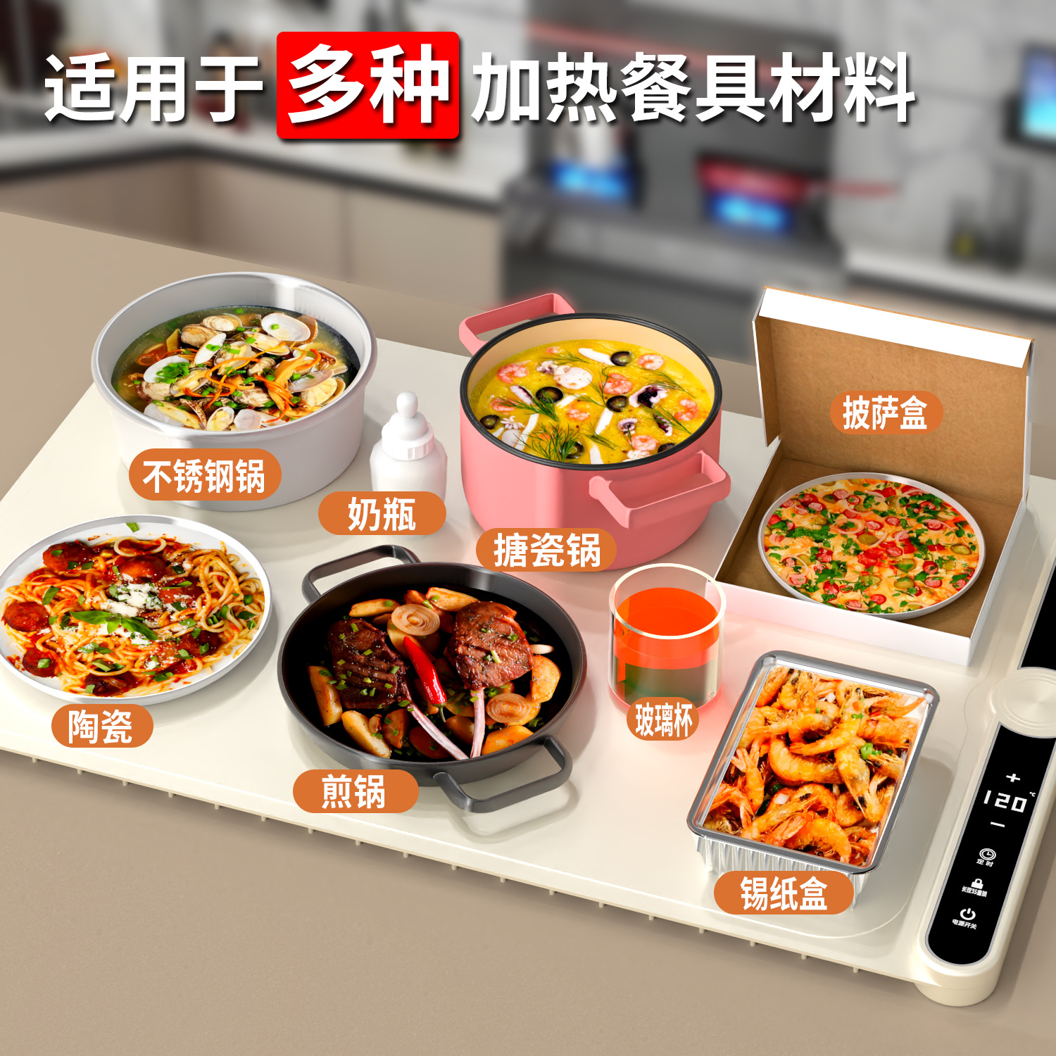 Конструкция с защитой от ожогов, не повреждает стол, не скользит, нагревается без запаха, подходит для различных материалов посуды.