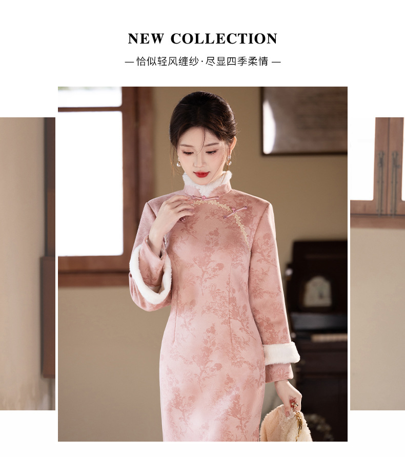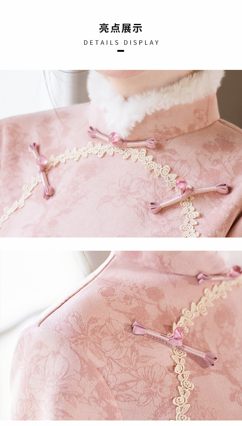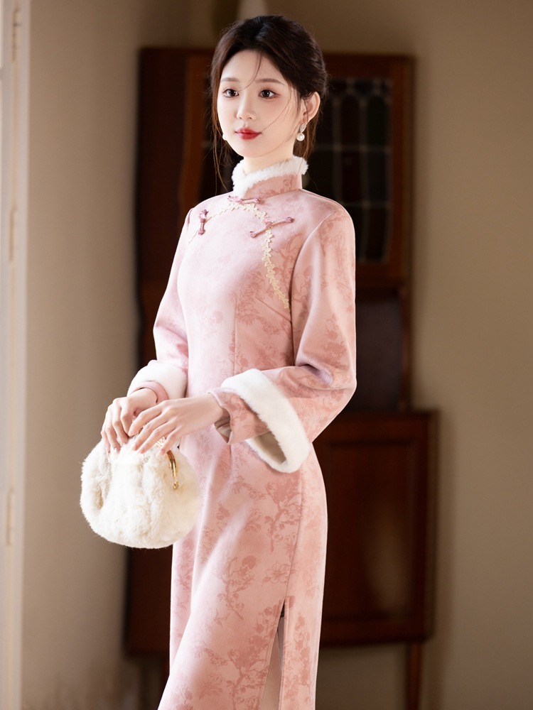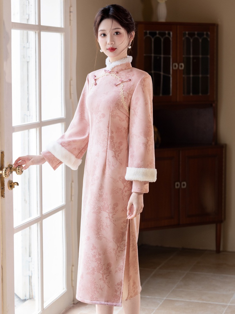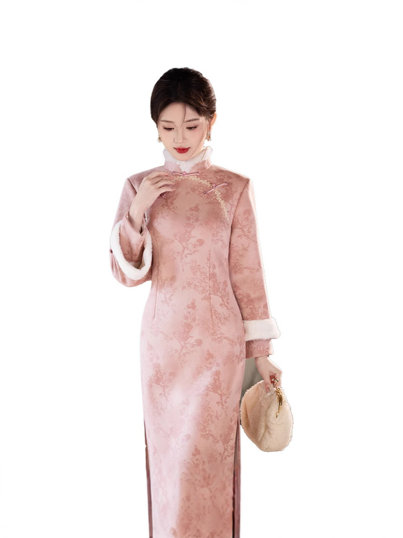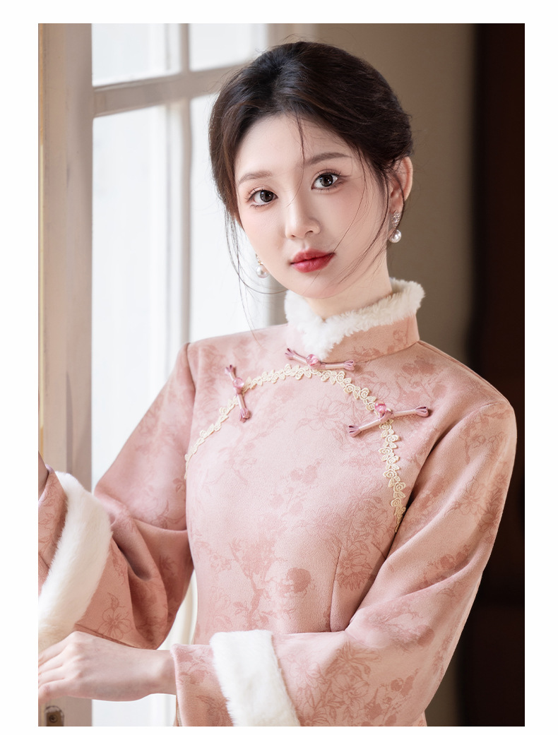 Bei Чжиюн розовый и элегантный женский поклонник теплый плюшевый воротник чонсам зимой 2024 новый плюшевый новый новый китайский стиль