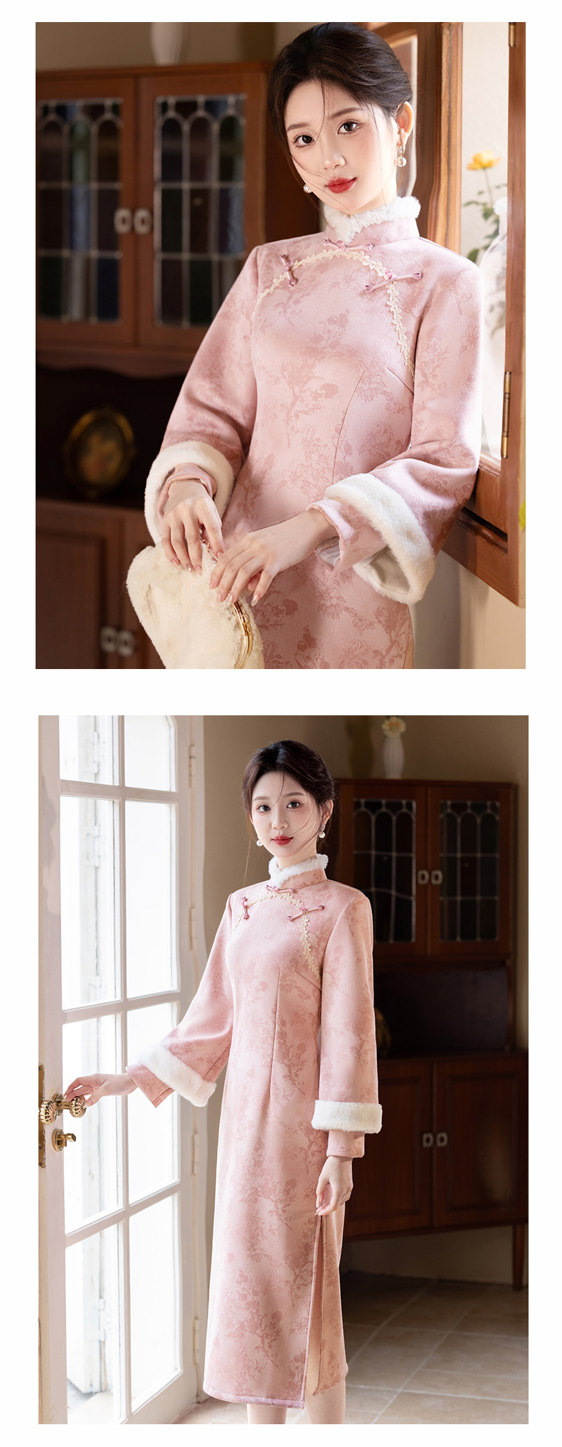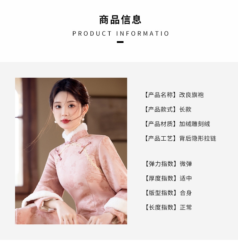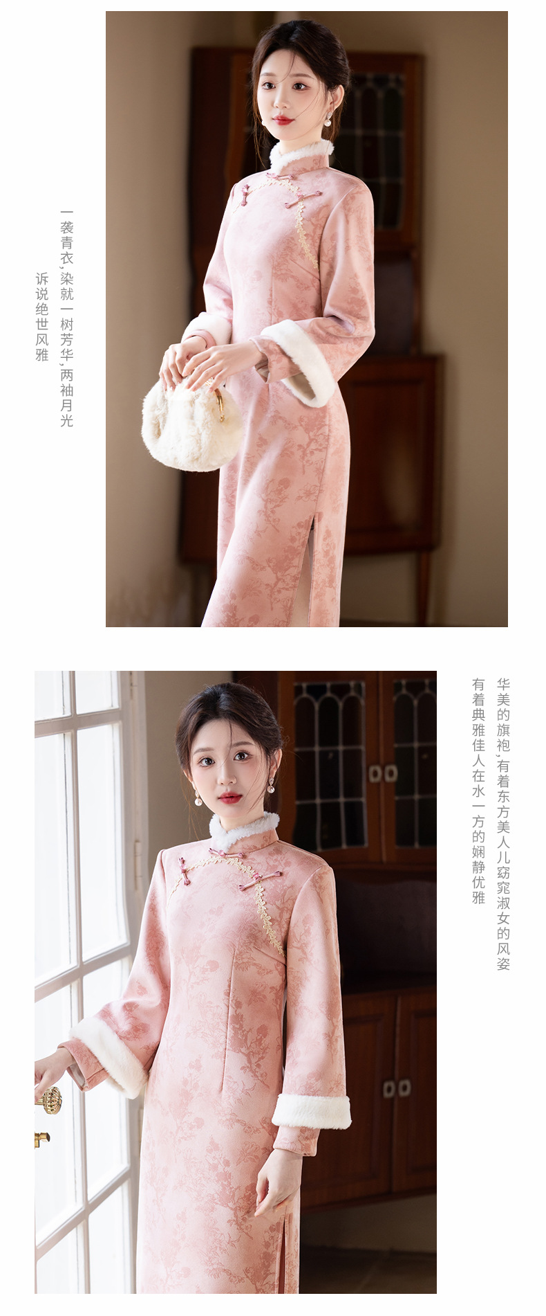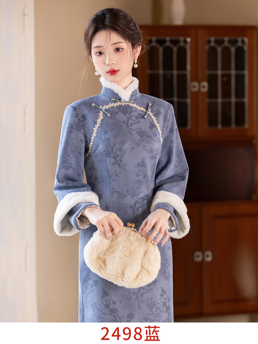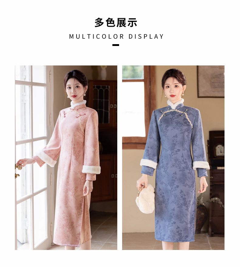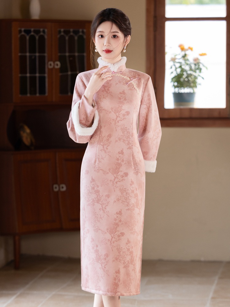 Bei Чжиюн розовый и элегантный женский поклонник теплый плюшевый воротник чонсам зимой 2024 новый плюшевый новый новый китайский стиль