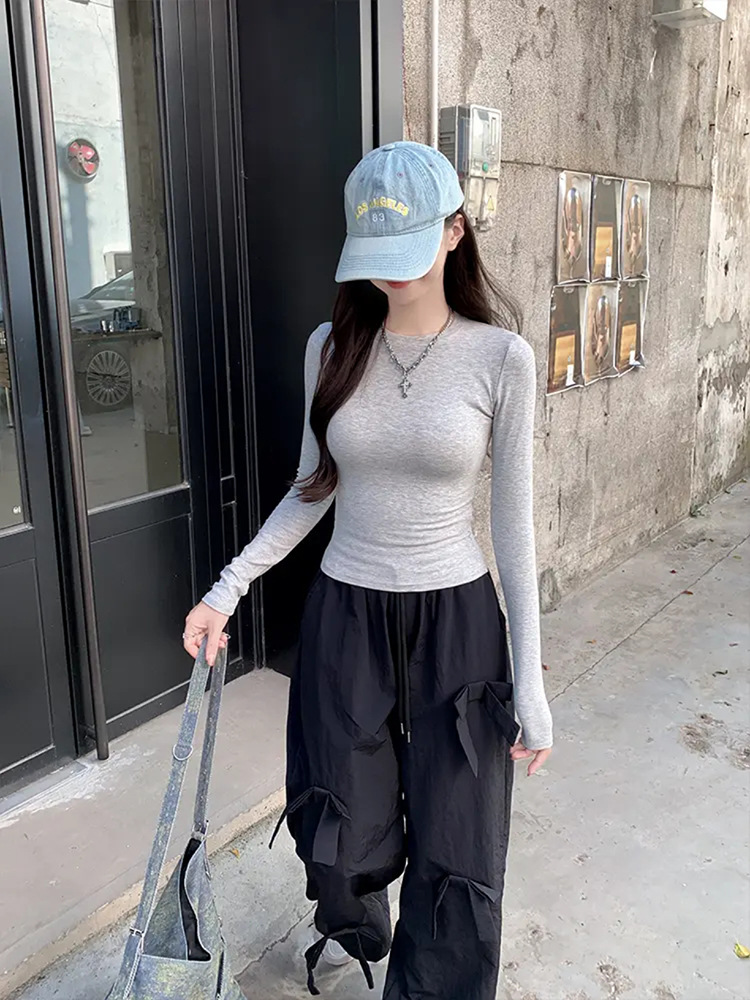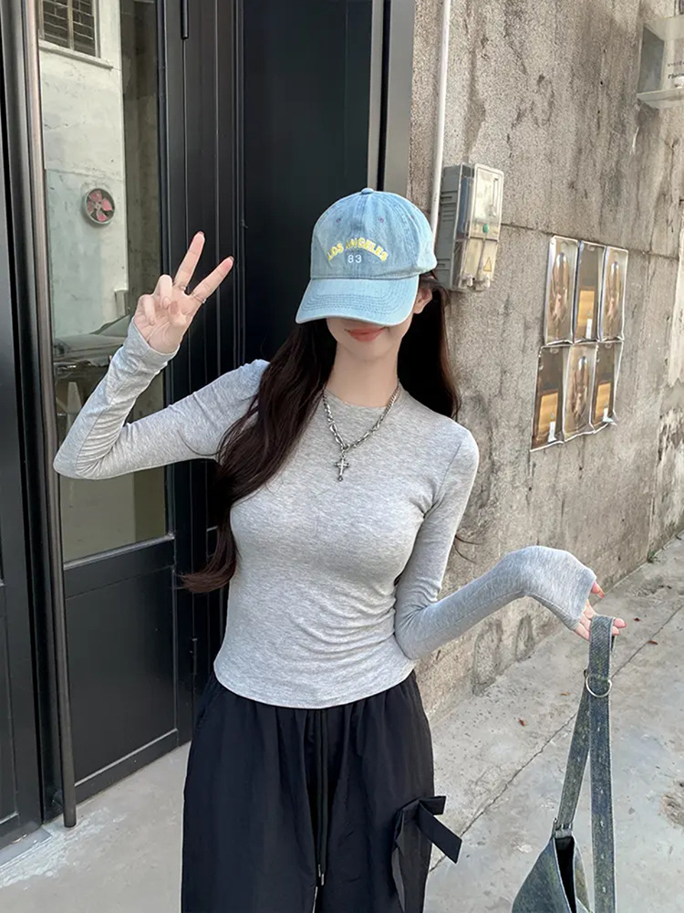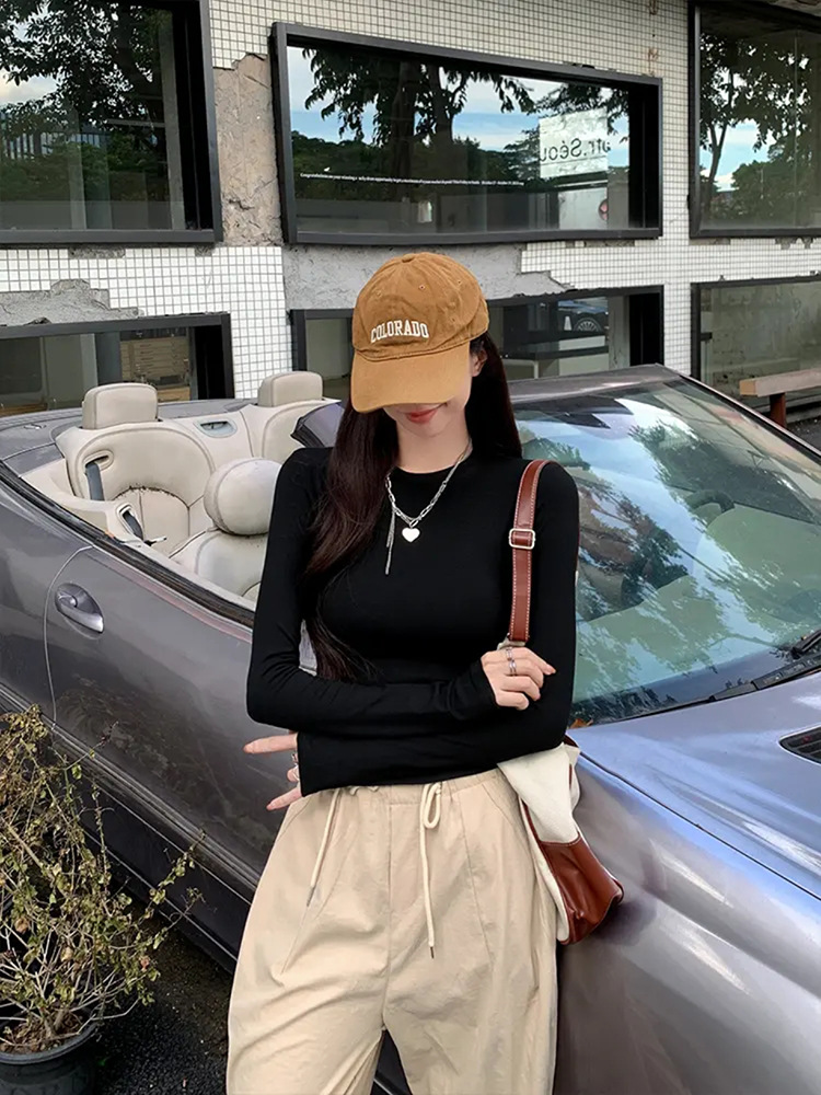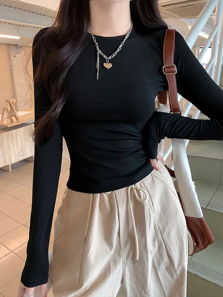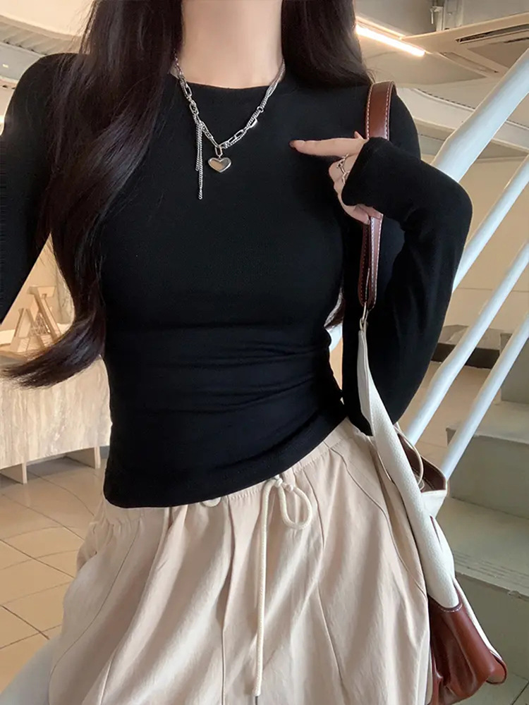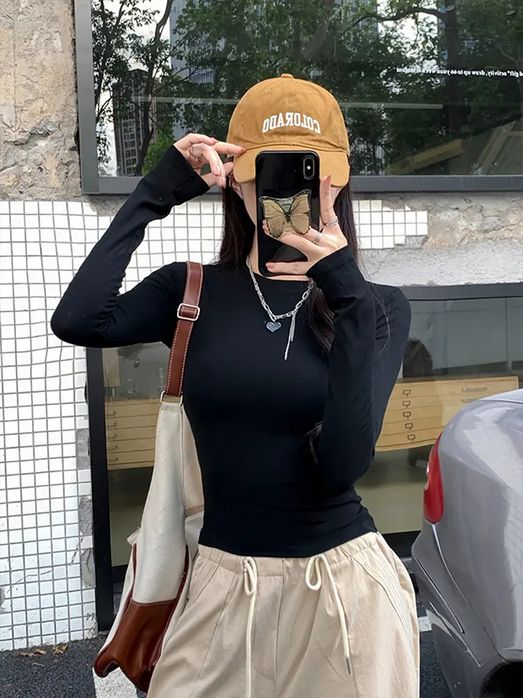 Футболка с длинными рукавами на талии и плече женская весенняя и осенняя стройная рубашка с тонким нижним дном 2025 новая курица с круглым вырезом