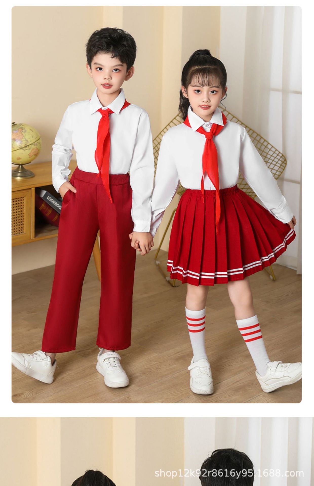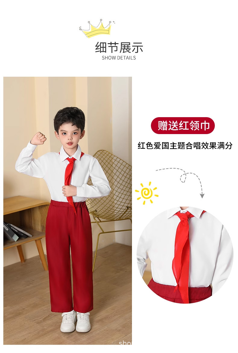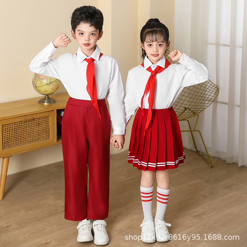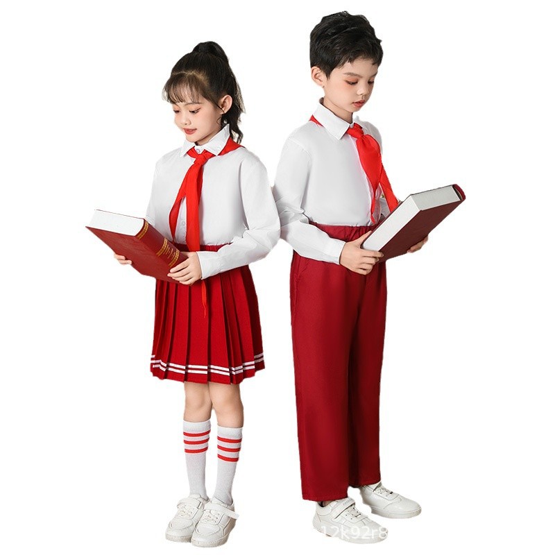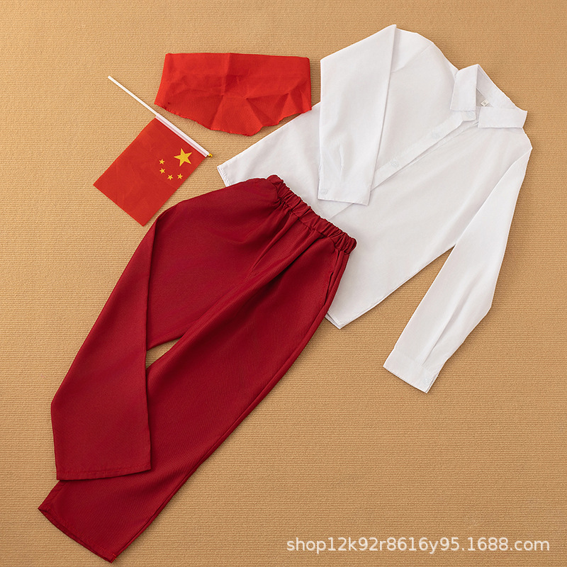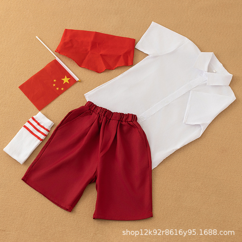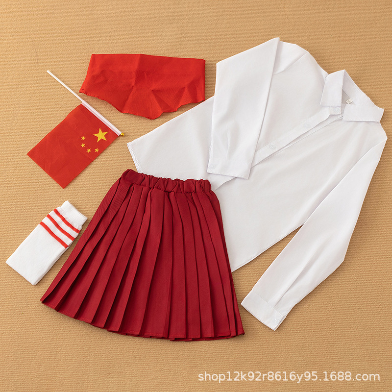 Белые короткие рукава + красная юбка + красный шарф + носки в красную полоску + флаг; Белые короткие рукава + красные шорты + красный шарф + носки в красную полоску + флаг; Белые короткие рукава + полосатая красная юбка + красный шарф + носки в красную полоску + флаг; Белые короткие рукава + красные брюки + красный шарф + носки в красную полоску + флаг; Белые длинные рукава + красная юбка + красный шарф + носки в красную полоску + флаг; Белые длинные рукава + красные брюки + красный шарф + носки в красную полоску + флаг; Белые длинные рукава + полосатая красная юбка + красный шарф + носки в красную полоску + флаг