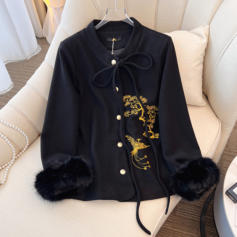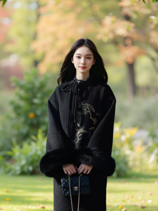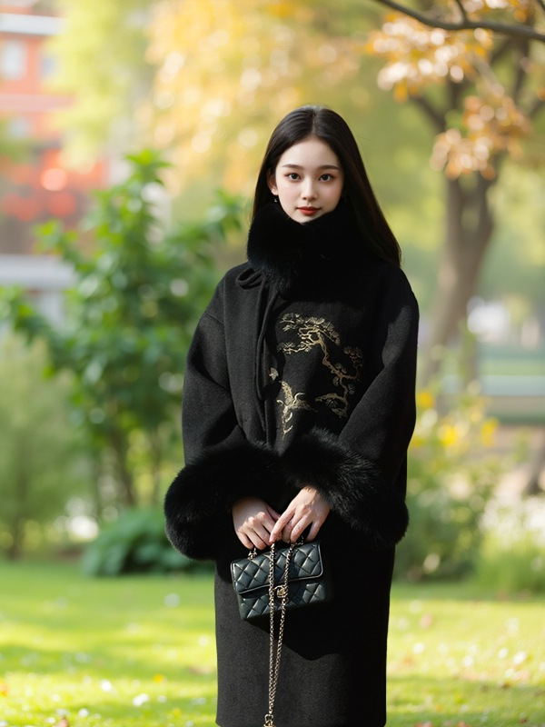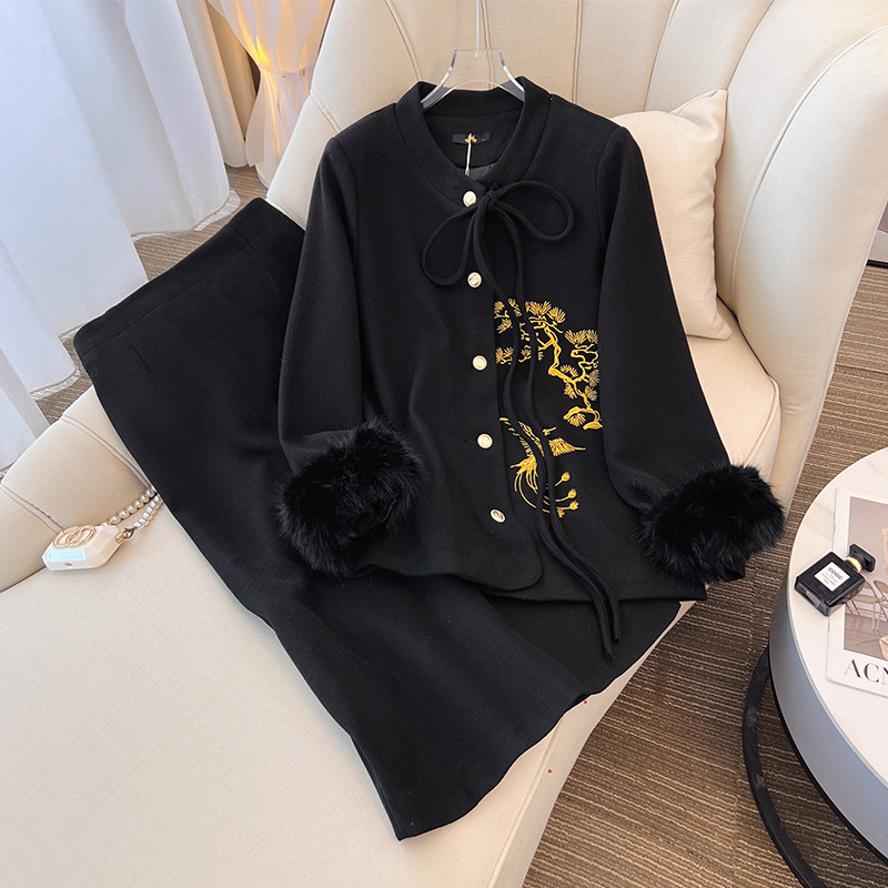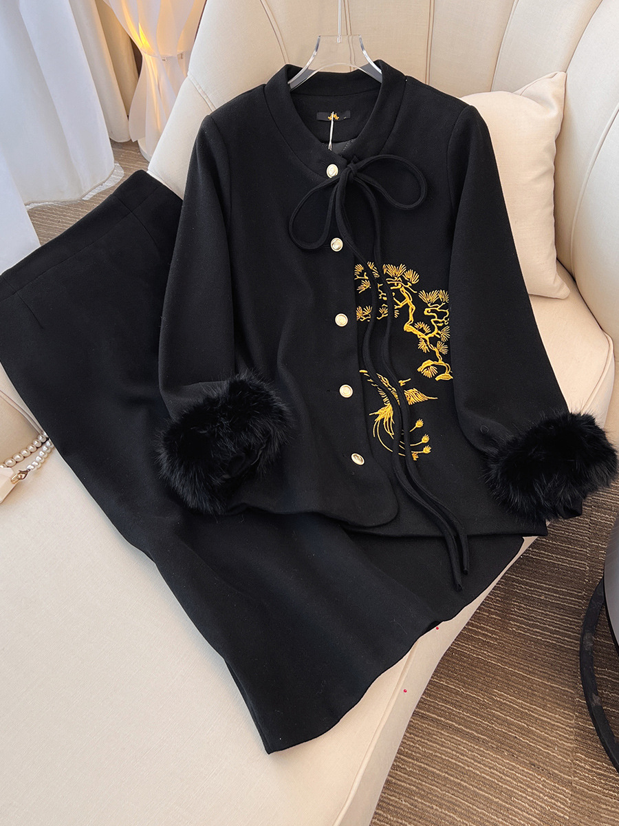 细节说明:外套是加厚夹棉款,不带毛领,适合5-15度穿,图案是刺绣工艺,正肩版型带肩垫,前面的纽扣都可以打开,毛袖可以取下。半身裙有内衬,有做松紧腰设计,有内衬,后面下摆有15cm左右开叉。
