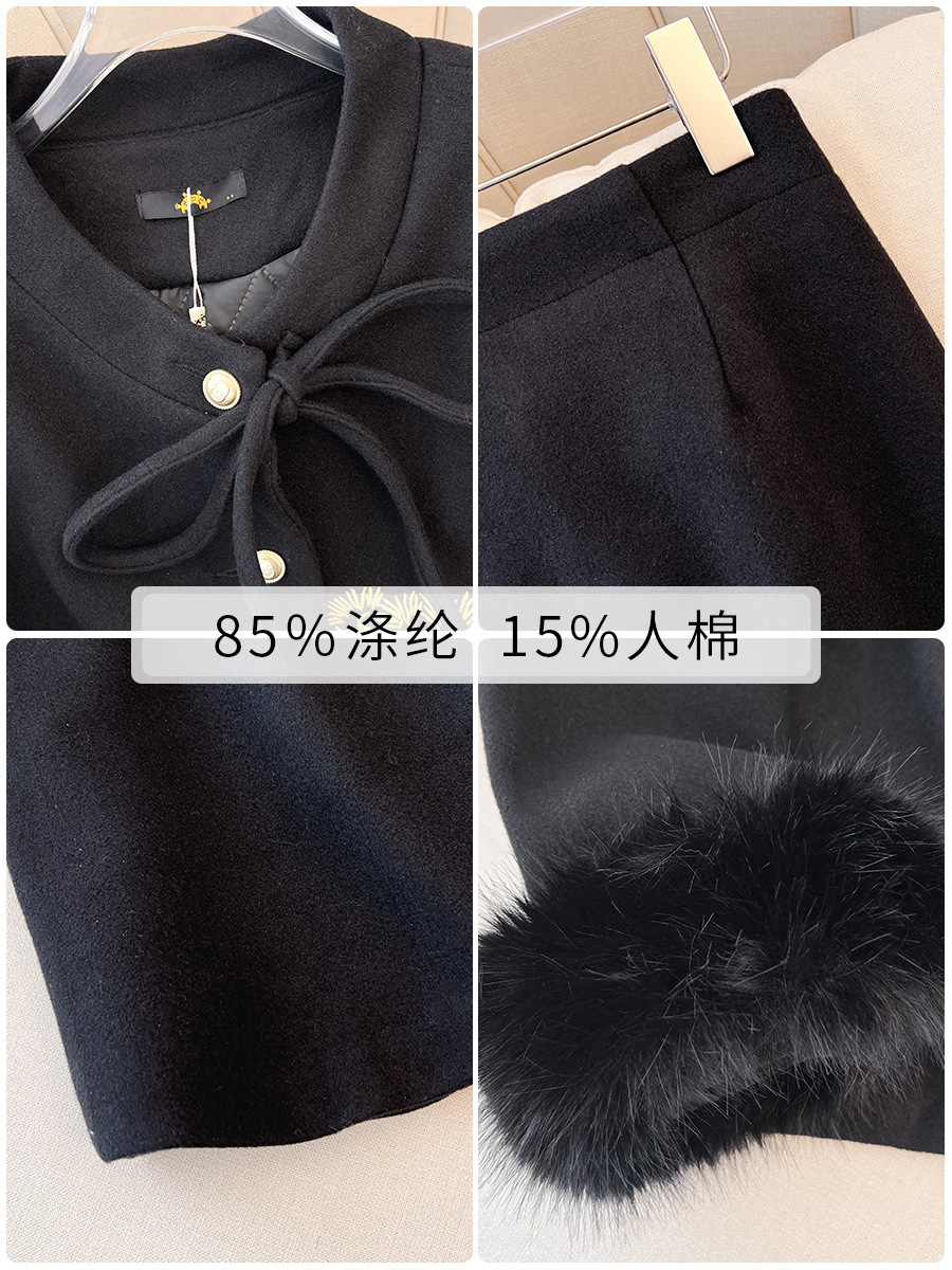 布料:呢料,外套里布:双面里,半身裙内衬:50D四面弹。成分:15%人棉85%涤纶