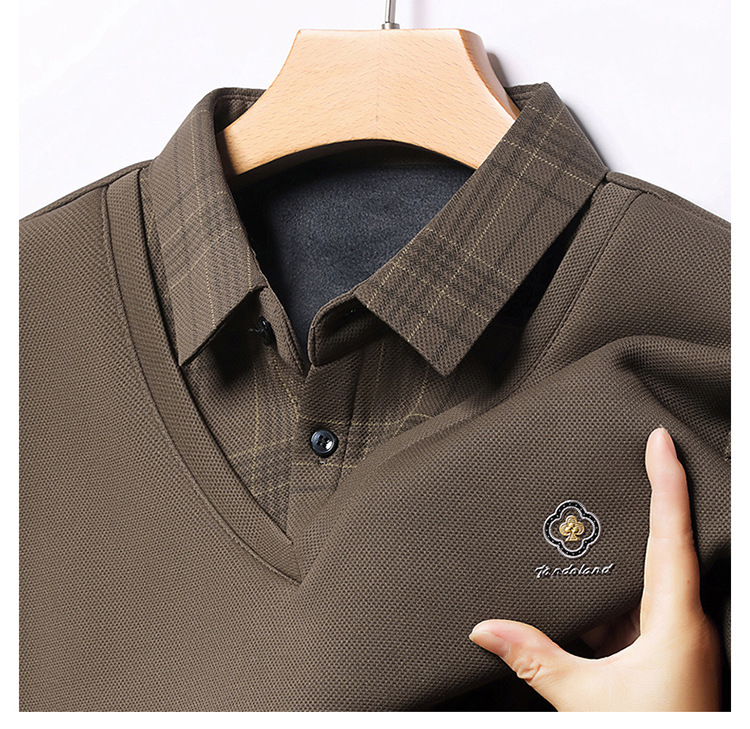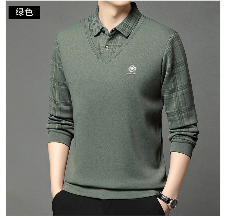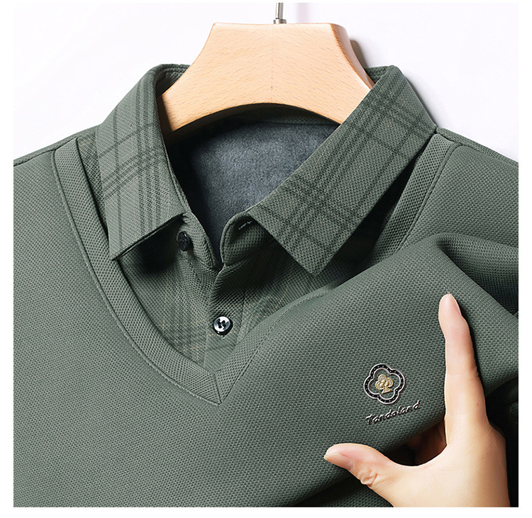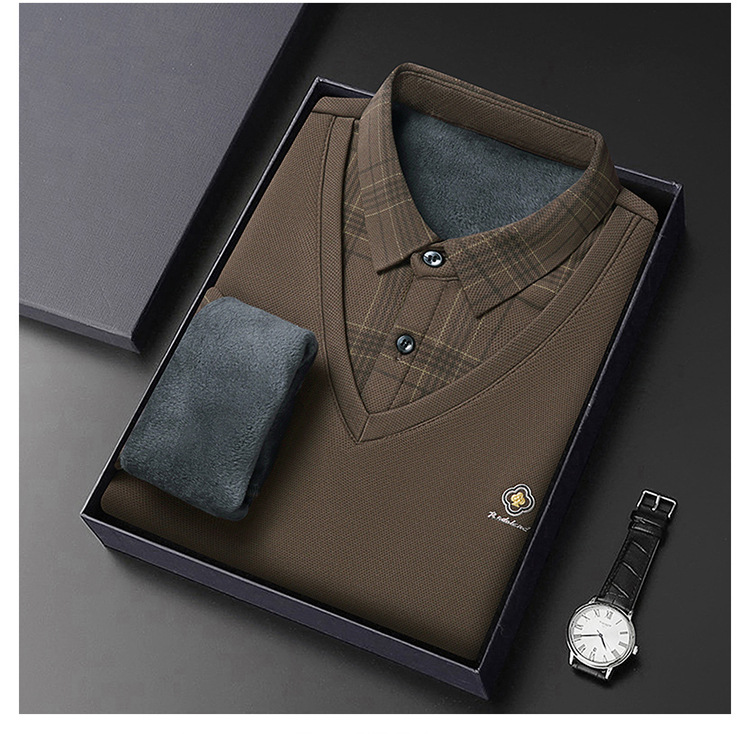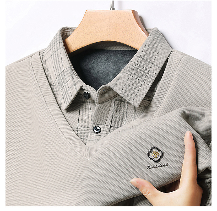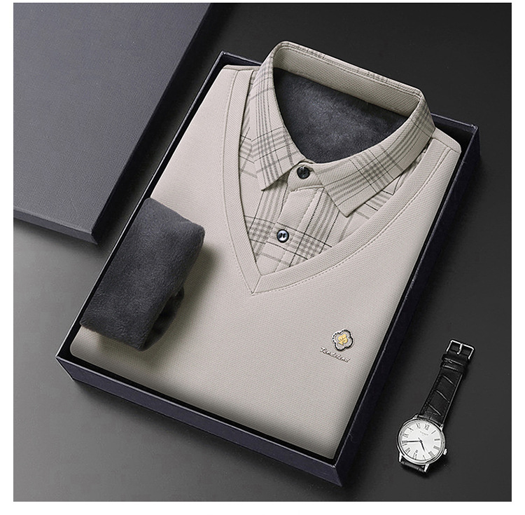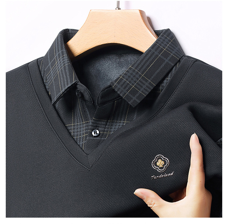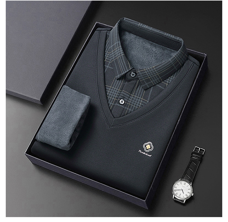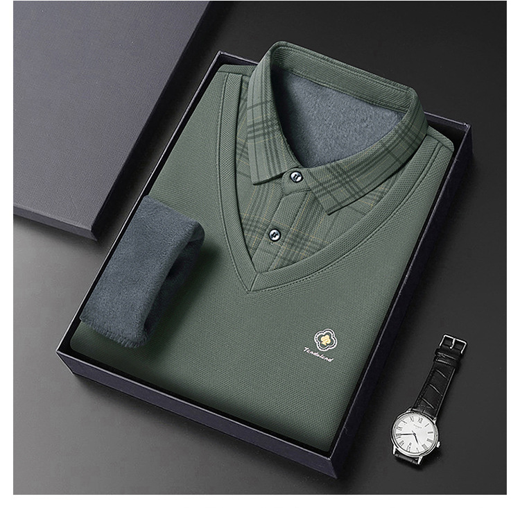 Осенняя и зимняя новая футболка с длинными рукавами для мужчин с отворотом поддельные две рубашки POLO бизнес-повседневная бархатная толстая нижняя рубашка