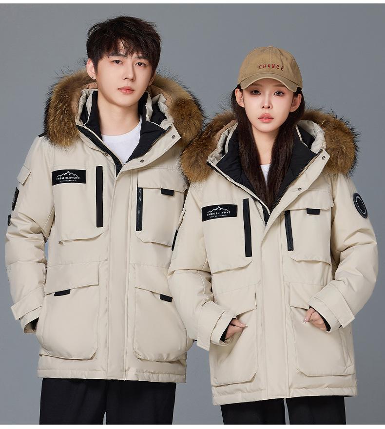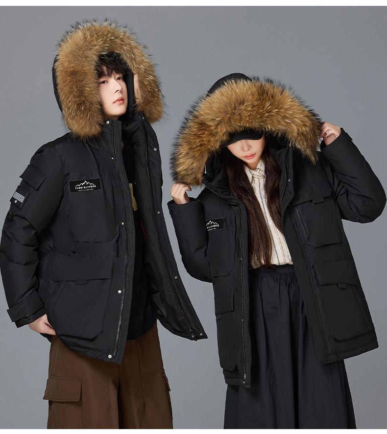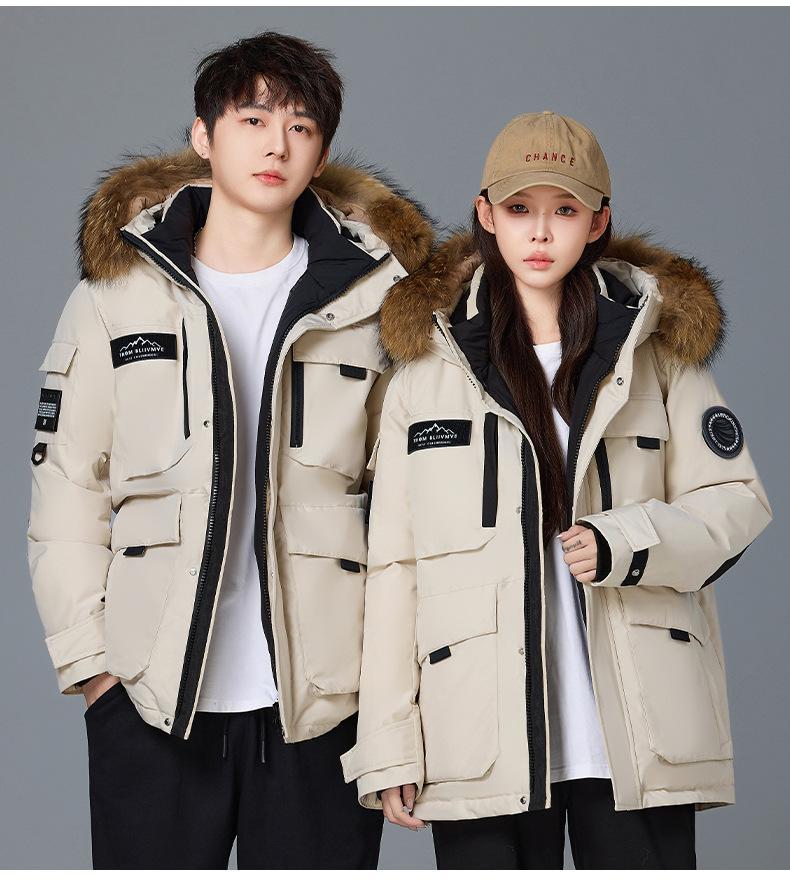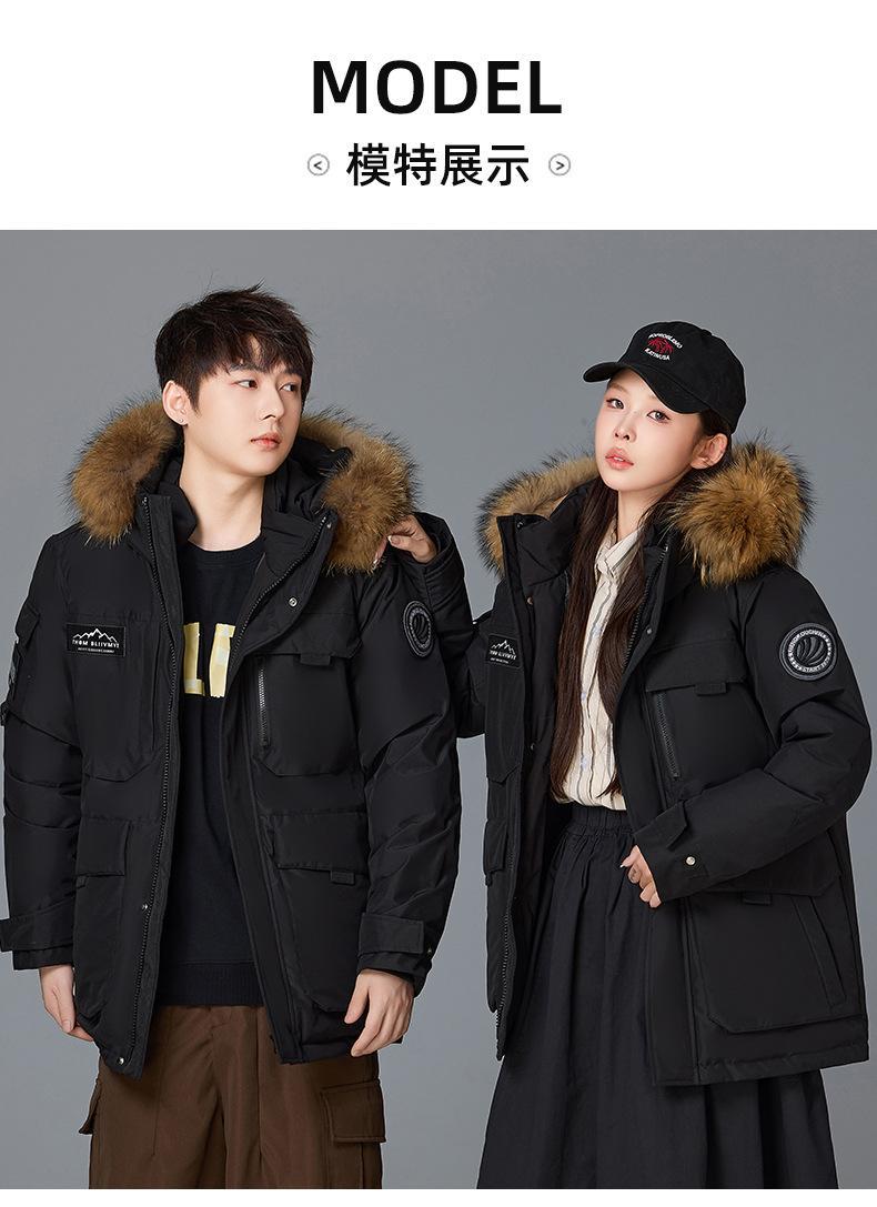 Новая утолщенная зимняя куртка-пуховик 2025 года для пар, унисекс, средней длины, с меховым воротником, теплая и стильная для активного отдыха.