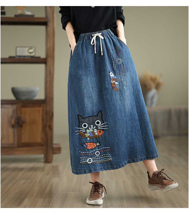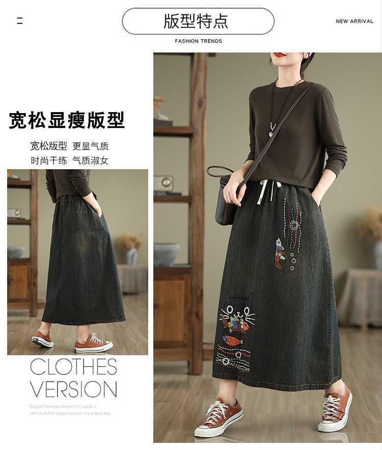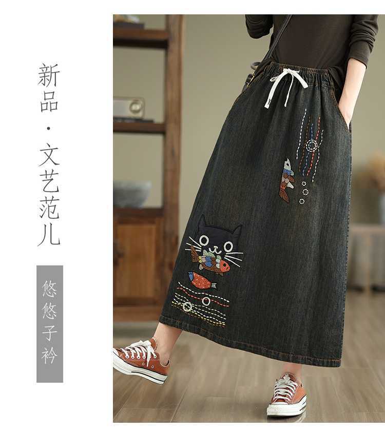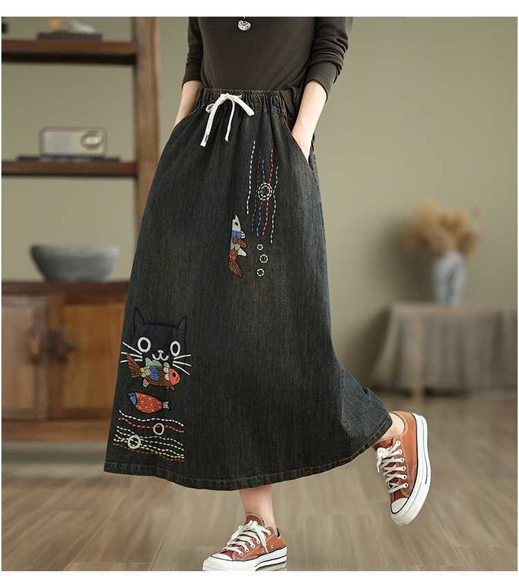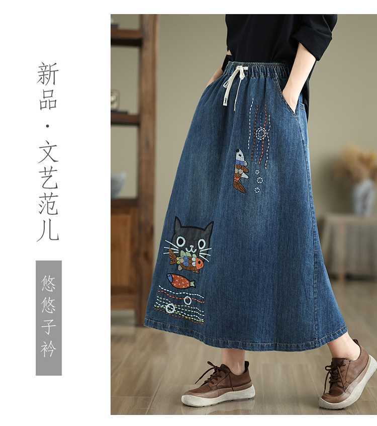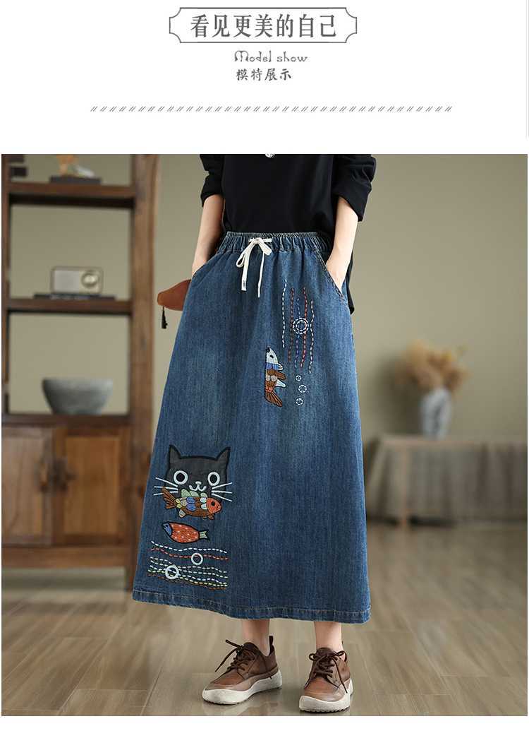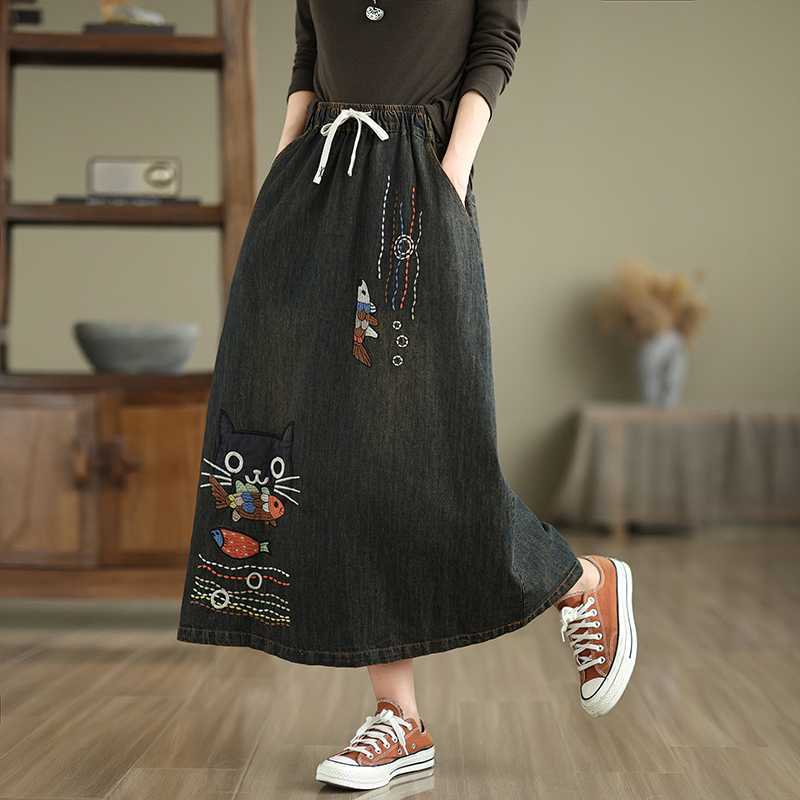Реальная осенняя новая свободная вышивка джинсовая длинная юбка для стирки