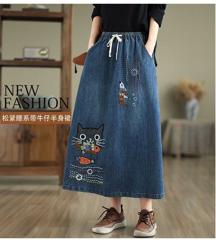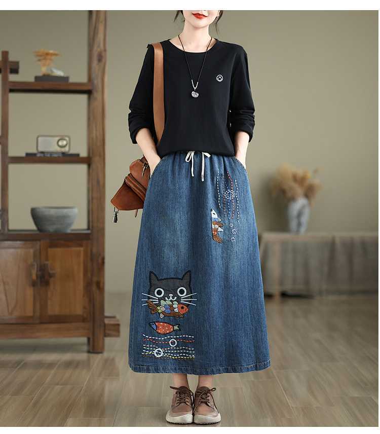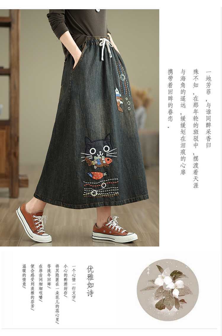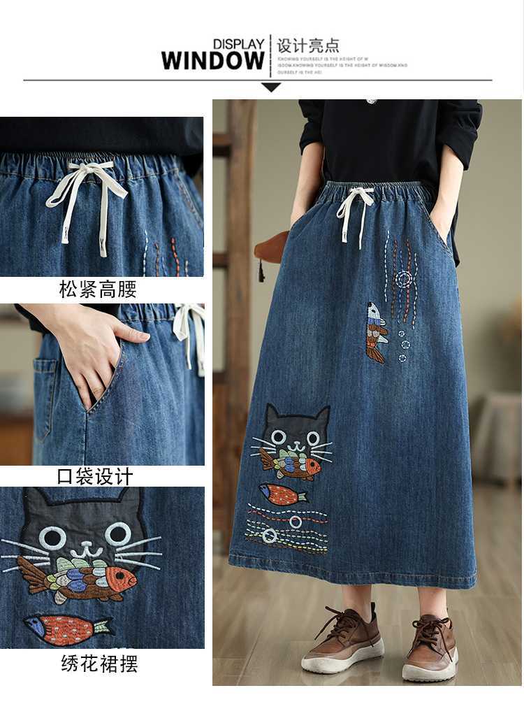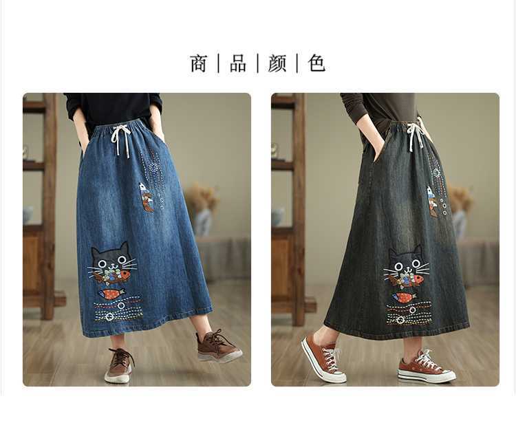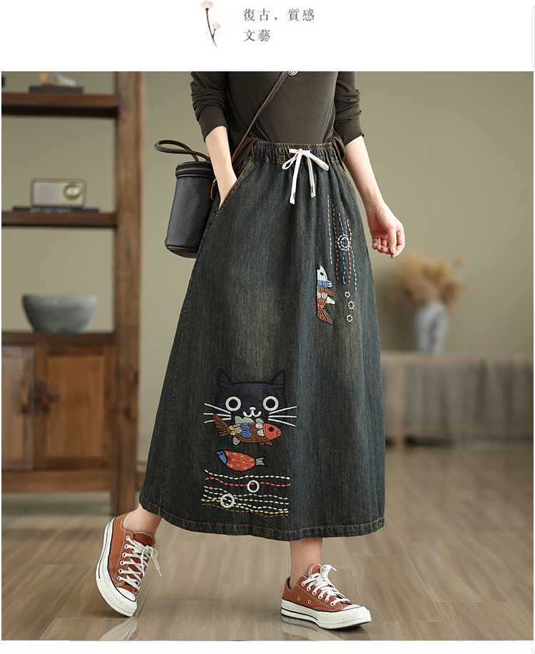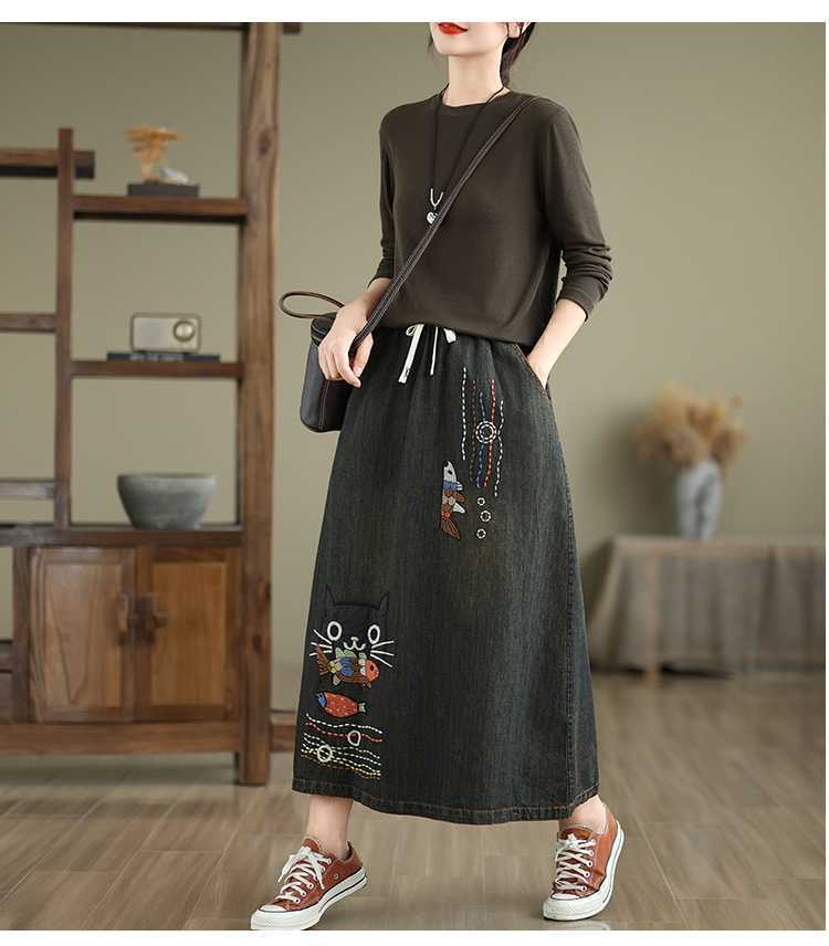 Реальная осенняя новая свободная вышивка джинсовая длинная юбка для стирки