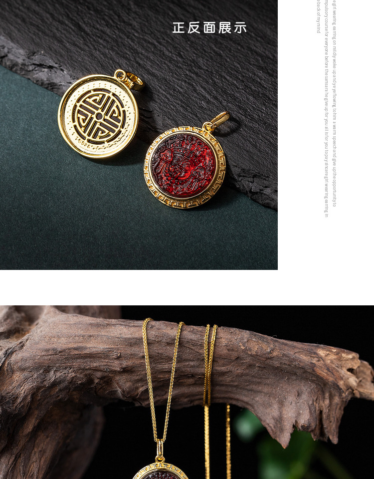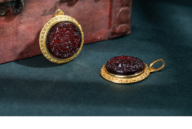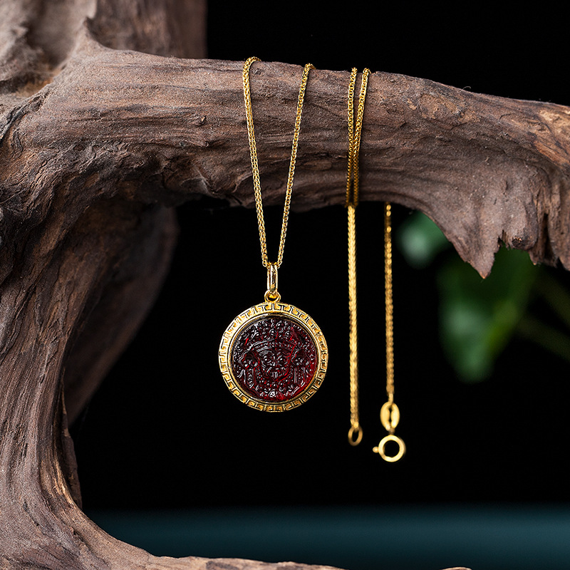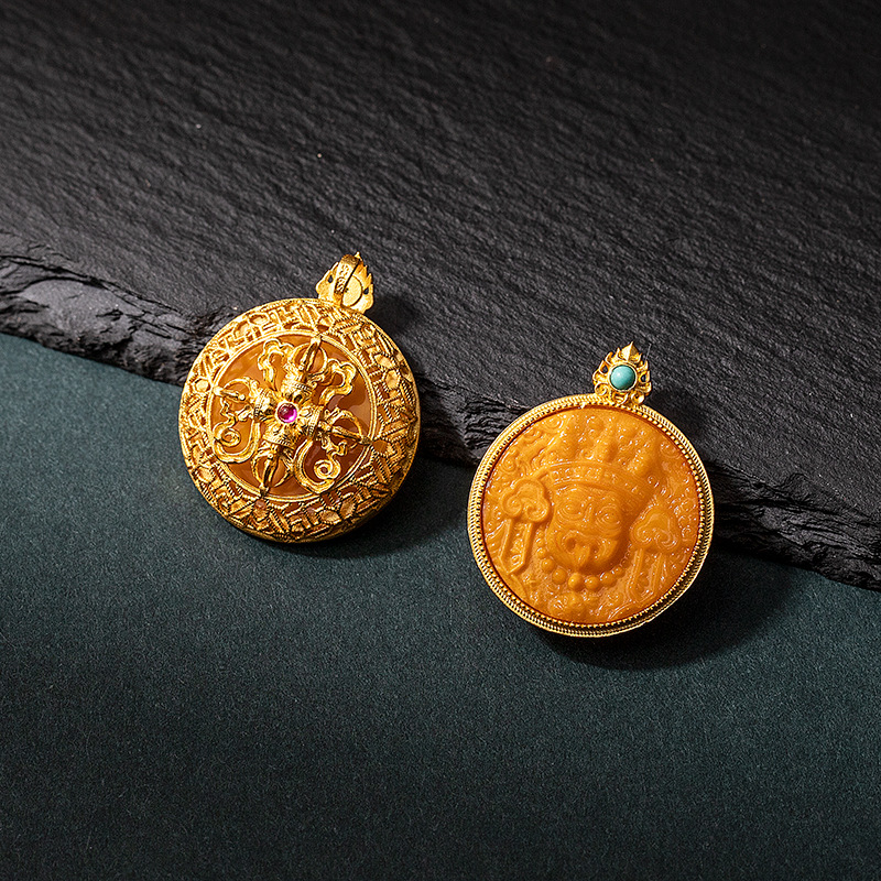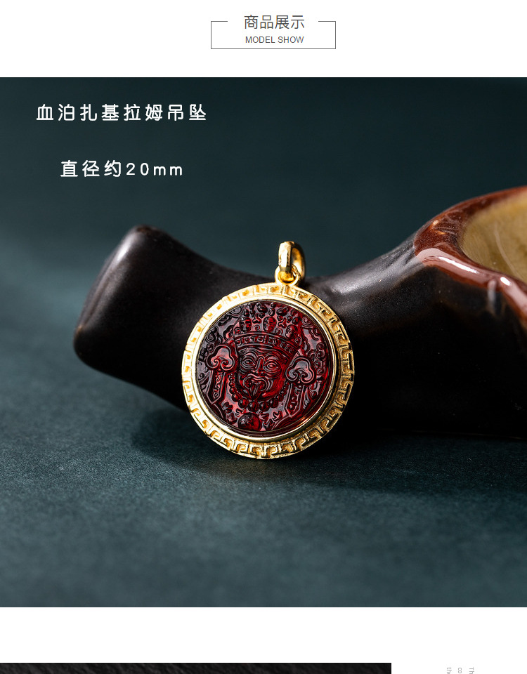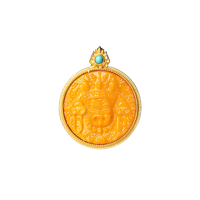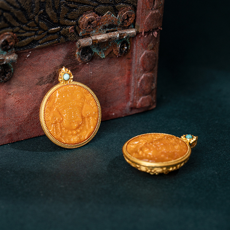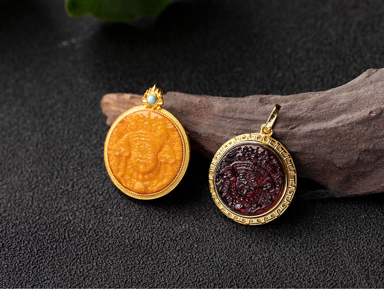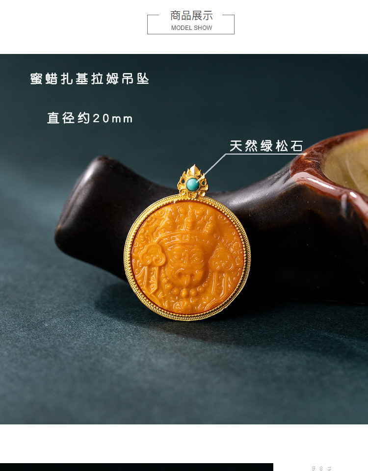S925 Серебряный позолоченный инкрустированный натуральный янтарный пчелиный воск Кровавый лоб, резьба Закирам Падающий волшебный пестик круглый кулон