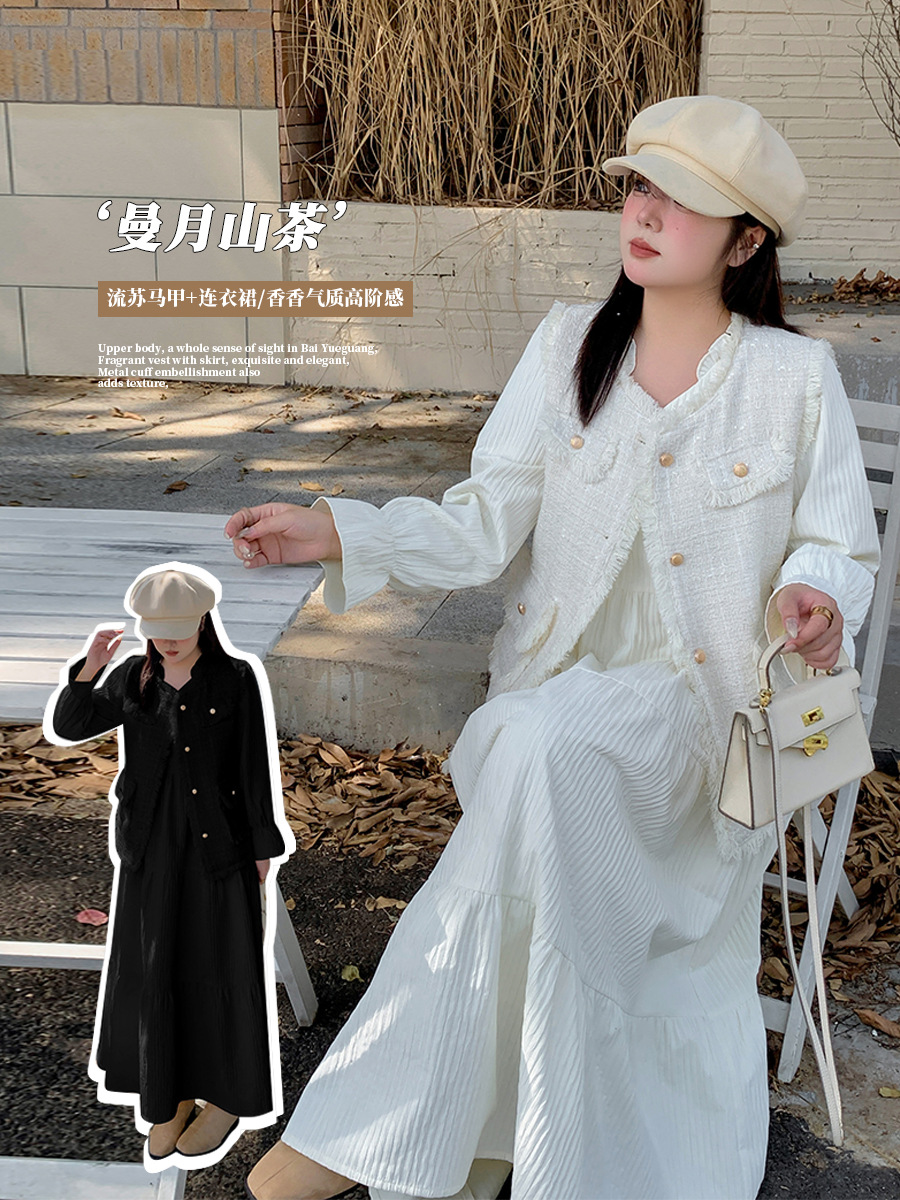 A0097 Xuanchen Весенний Новый Стиль: Комплект из Элегантного Платья-Топа с Длинным Рукавом и Жилета, Однотонный, Больших Размеров