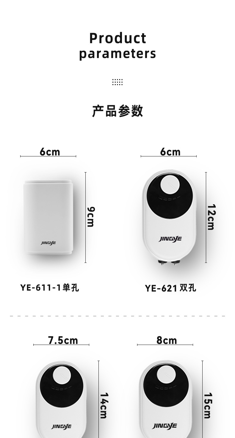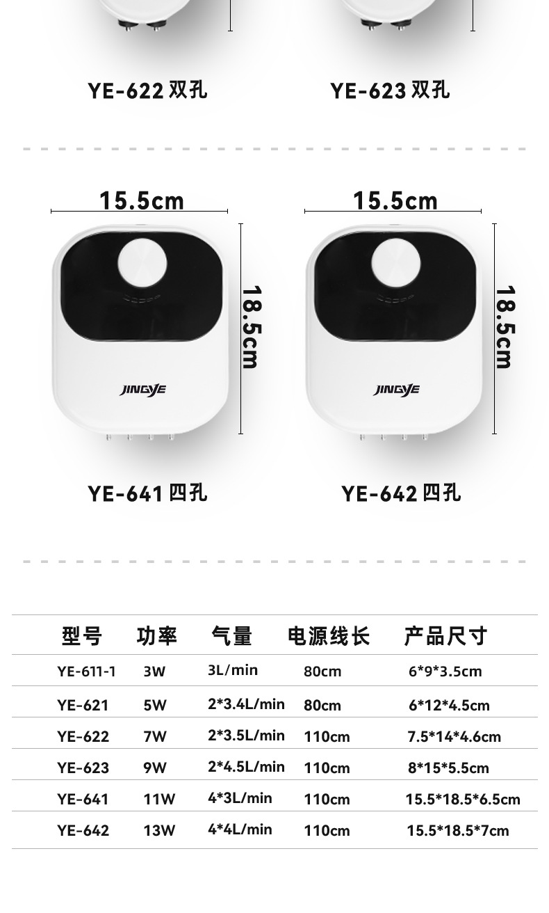 YE-611 Голый насос 3 Вт с одним выходом (Лимитированная серия); YE-611-1 голый насос 3 Вт с одним отверстием; YE-621 голый насос 5 Вт с двойным отверстием; YE-622 голый насос 7 Вт с двойным отверстием; YE-623 голый насос 9 Вт с двойным отверстием; YE-641 голый насос 11 Вт с четырьмя отверстиями; YE-642 голый насос 13 Вт с четырьмя отверстиями