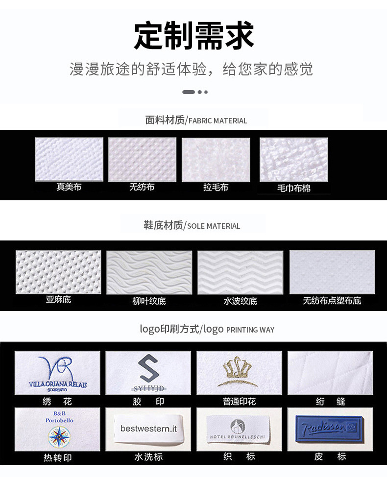 Плюшевые льняные тапочки 6 мм (500 пар в пакете); Плюшевые тапочки с рисунком листьев ивы 6 мм (500 пар в пакетах); Тапочки из льняной ткани толщиной 5 мм (500 пар в сумке)