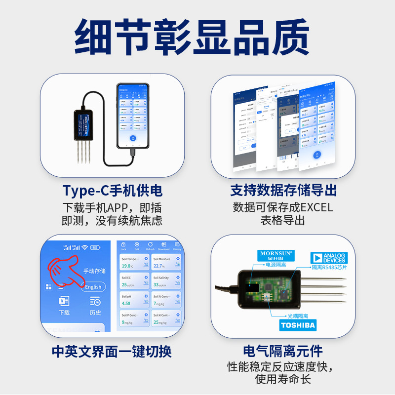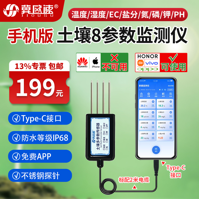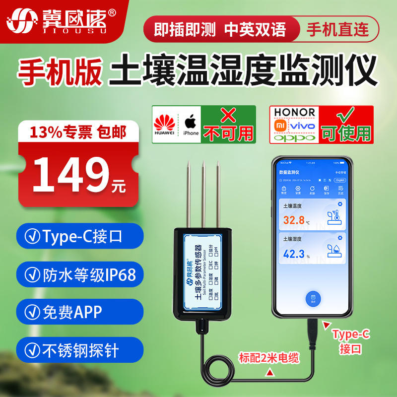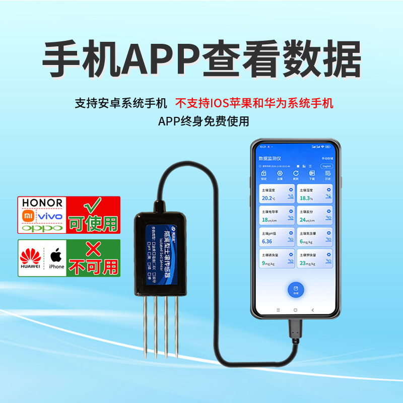 Мобильный телефон с детектором почвы для просмотра данных на китайском и английском языках может хранить температуру и влажность, значение pH, азота, фосфора и калия, датчик солей EC.