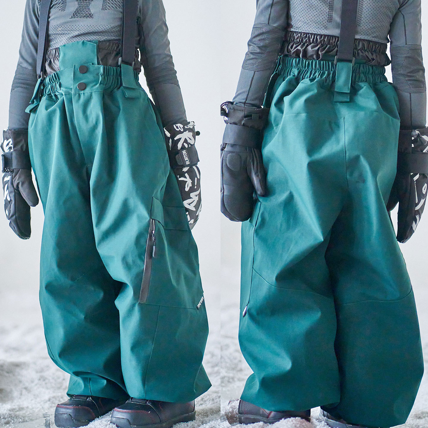 Темно-зеленый трехцветный верх; Темно-зеленый комбинезон; Темно-зеленые брюки широкого кроя.