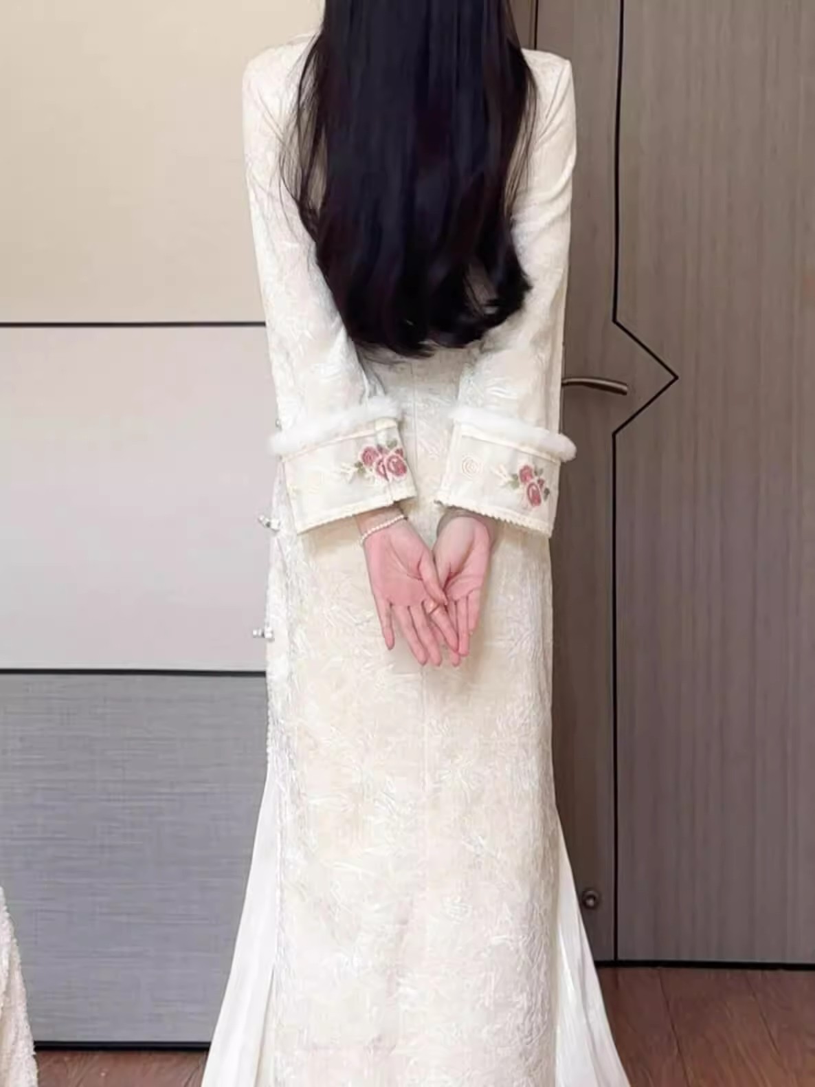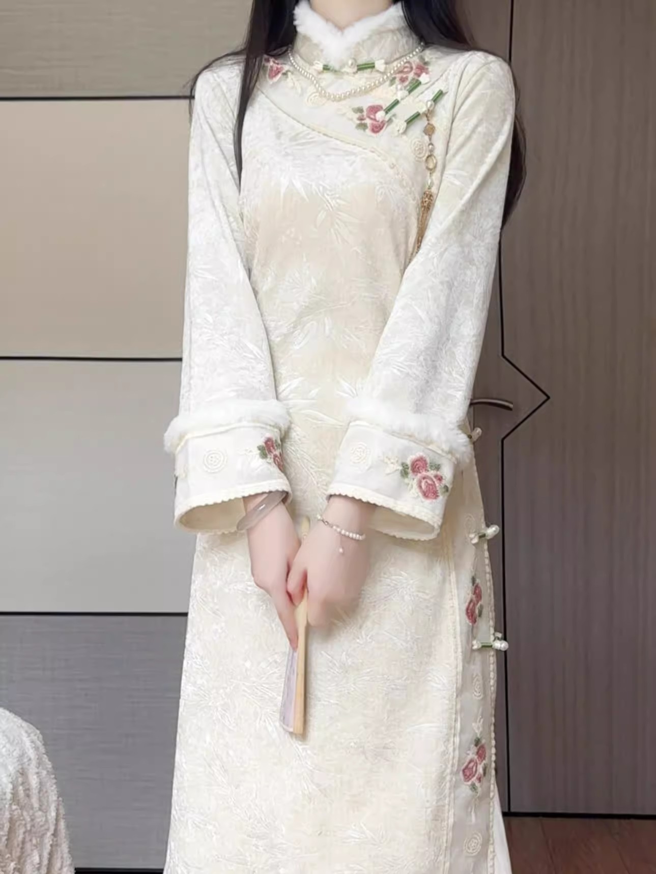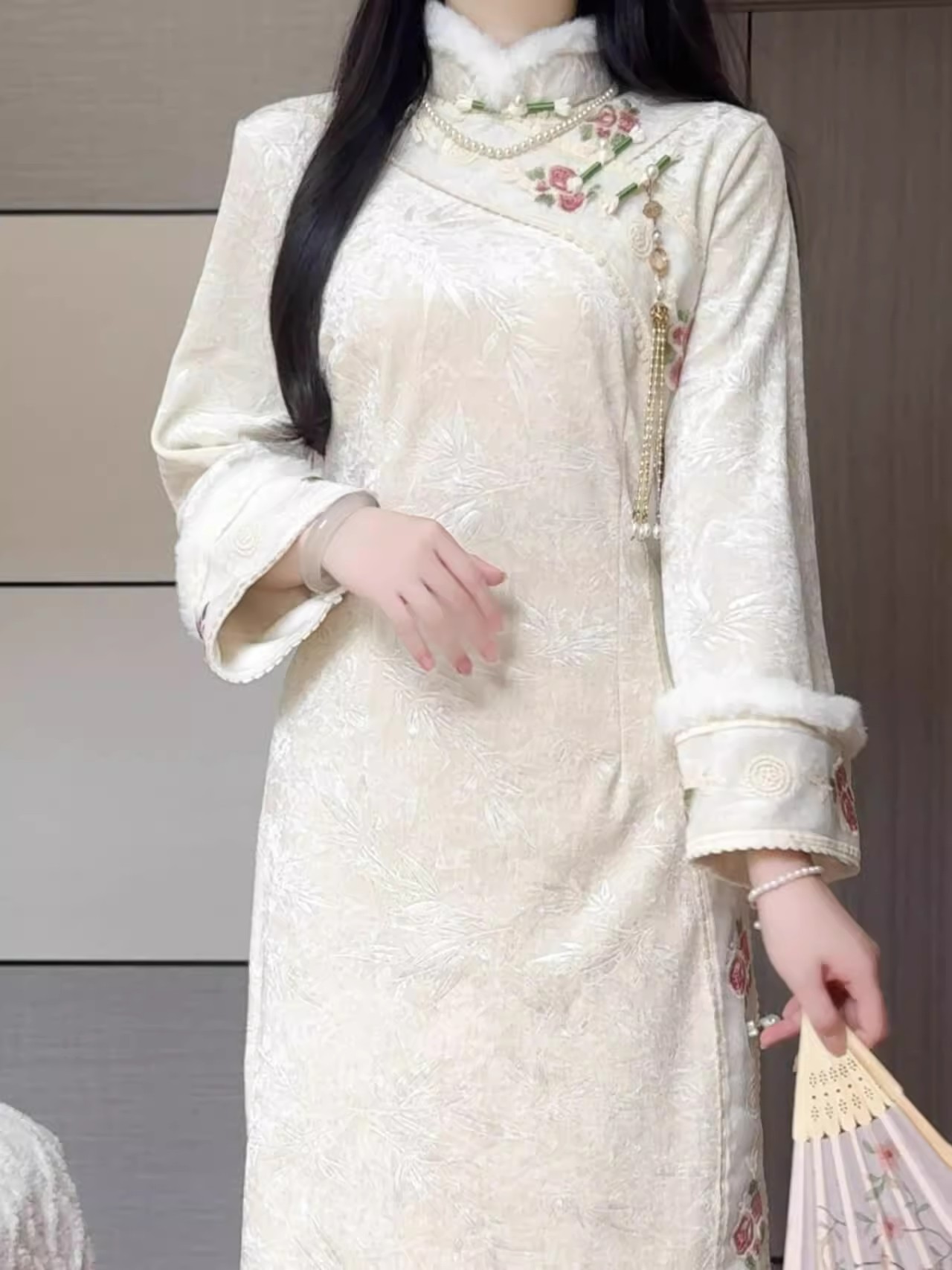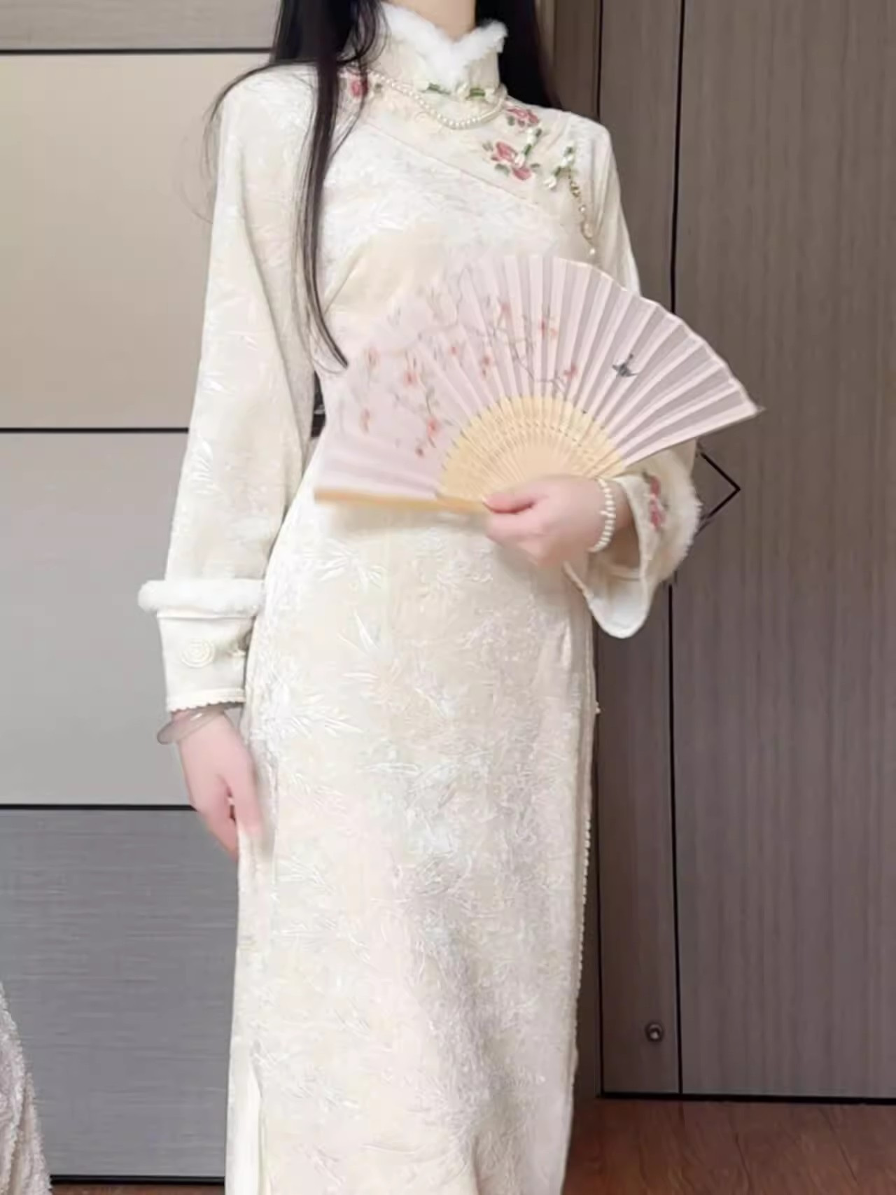 Белый перевернутый рукав с длинными рукавами Cheongsam улучшен осенью и зимой