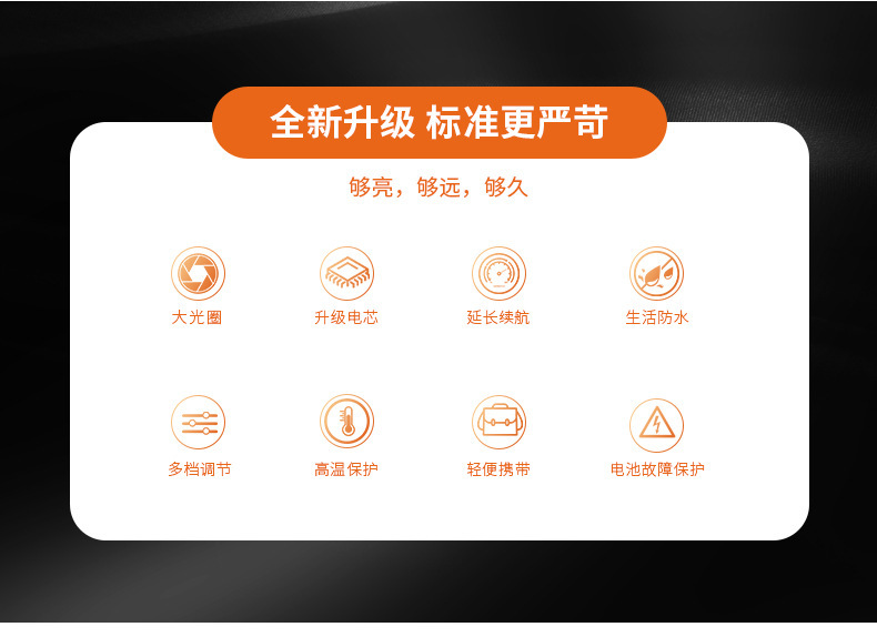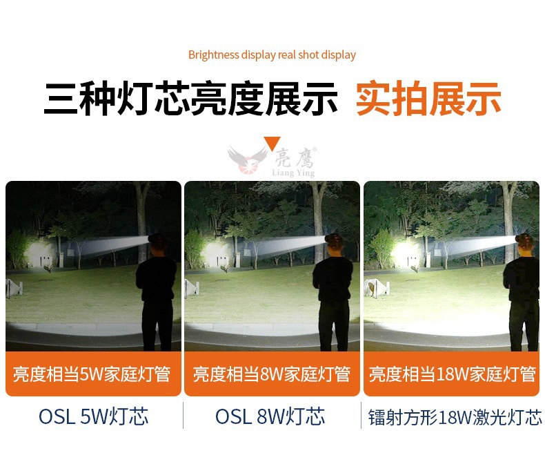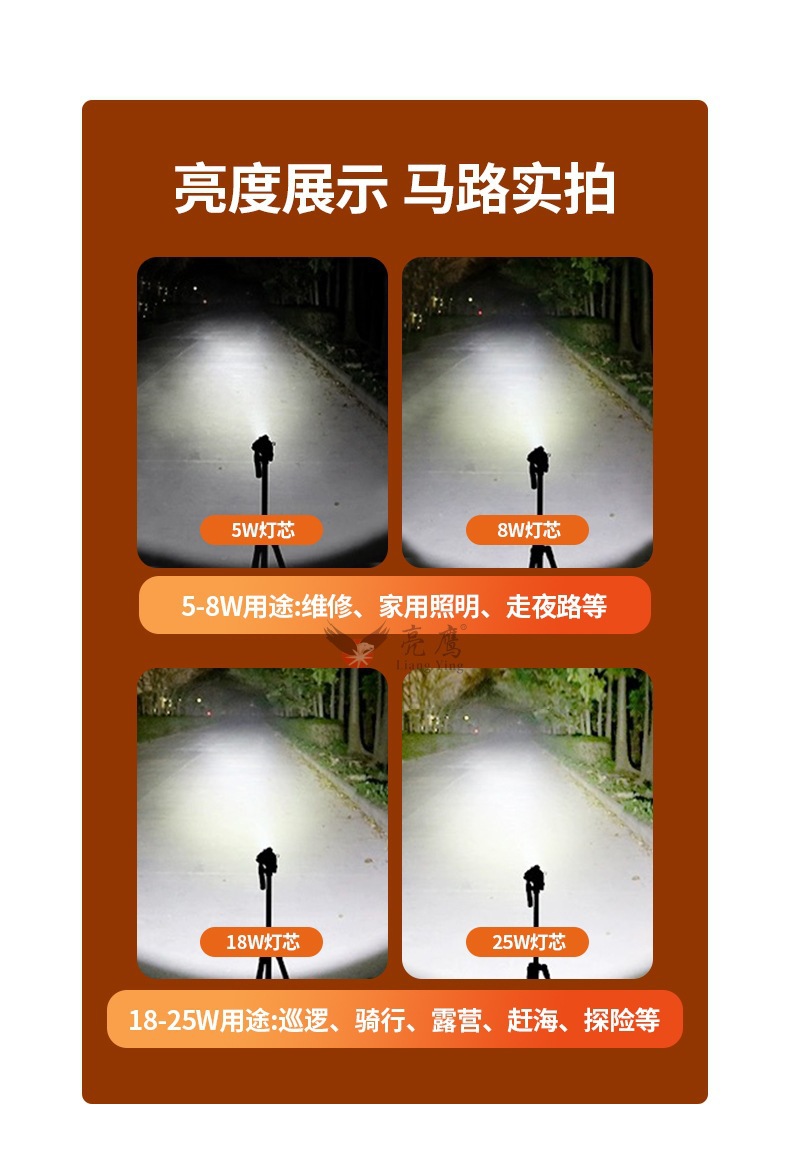 Первичный белый свет, яркость 5 Вт, сильная светопроницаемость, 18-20 часов, литиевая батарея емкостью 3000 мАч; Первичный белый свет, яркость 5 Вт, сильная светопроницаемость, 22-24 часа, 5200 мАч, литиевая батарея; Промежуточный белый свет, 8 Вт, высокая яркая светопроницаемость, 16-18 часов, литиевая батарея емкостью 3800 мАч; Стильный белый свет 18 Вт, супер яркий, сильный свет, 14-15 часов, 5200 мАч, литиевая батарея; Верхний белый свет, 25 Вт, самая яркая, сильная светопередача, 11-12 часов, 5200 мАч, литиевая батарея