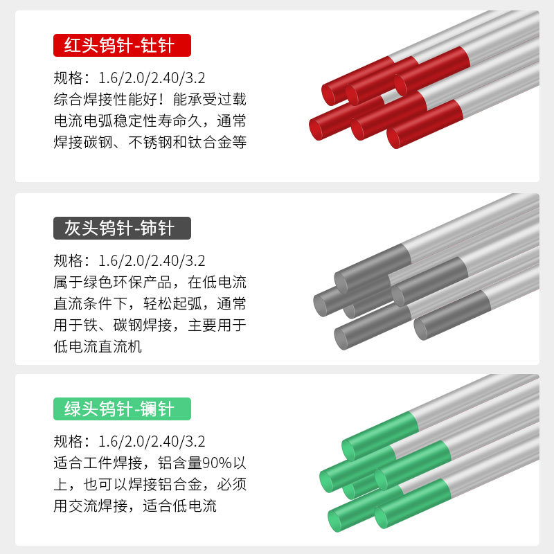 Пекинский вольфрамовый электрод с красной головкой Beiwu 1,6*150 мм (1 шт.); Пекинский вольфрамовый электрод с красной головкой Beiwu 2,0*150 мм (1 шт.); Пекинский вольфрамовый электрод с красной головкой Beiwu 2,4*150 мм (1 шт.); Пекинский вольфрамовый электрод с красной головкой Beiwu 3,0*150 мм (1 шт.); Пекинский вольфрамовый электрод с красной головкой Beiwu 3,2*150 мм (1 шт.); Пекинский вольфрамовый электрод с красной головкой Beiwu 4,0*150 мм (1 шт.); Пекинский серый вольфрамовый электрод Beiwu 1,6*150 мм (1 шт.); Пекинский серый вольфрамовый электрод Beiwu 2,0*150 мм (1 шт.); Пекинский серый вольфрамовый электрод Beiwu 2,4*150 мм (1 шт.); Пекинский серый вольфрамовый электрод Beiwu 3,0*150 мм (1 шт.); Пекинский серый вольфрамовый электрод Beiwu 3,2*150 мм (1 шт.); Пекинский вольфрамовый электрод с зеленой головкой Beiwu 1,6*150 мм (1 шт.); Пекинский вольфрамовый электрод с зеленой головкой Beiwu 2,0*150 мм (1 шт.); Пекинский вольфрамовый электрод с зеленой головкой Beiwu 2,4*150 мм (1 шт.); Пекинский вольфрамовый электрод с зеленой головкой Beiwu 3,0*150 мм (1 шт.); Пекинский вольфрамовый электрод с зеленой головкой Beiwu 3,2*150 мм (1 шт.)