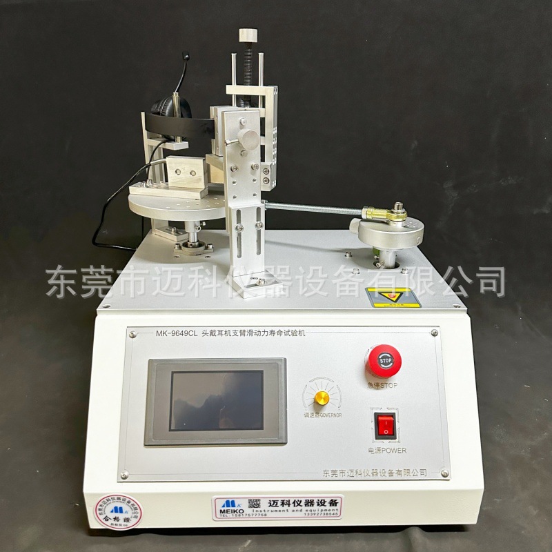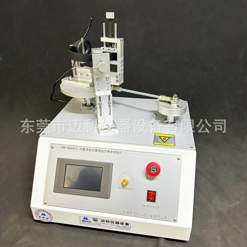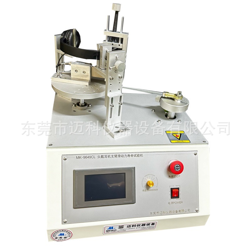 头戴耳机支臂滑动力寿命试验机用于头戴耳机支臂、滑轨的滑行力寿命测试。头戴耳机支臂滑动力寿命试验机是将耳机一端固定在治具上,另一端固定在滑动治具上反复滑动测试,可同时测试且显示插峰值、拔峰值、实时力值、测试速度、次数等。