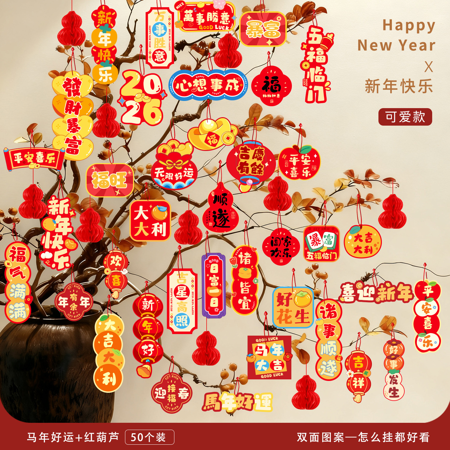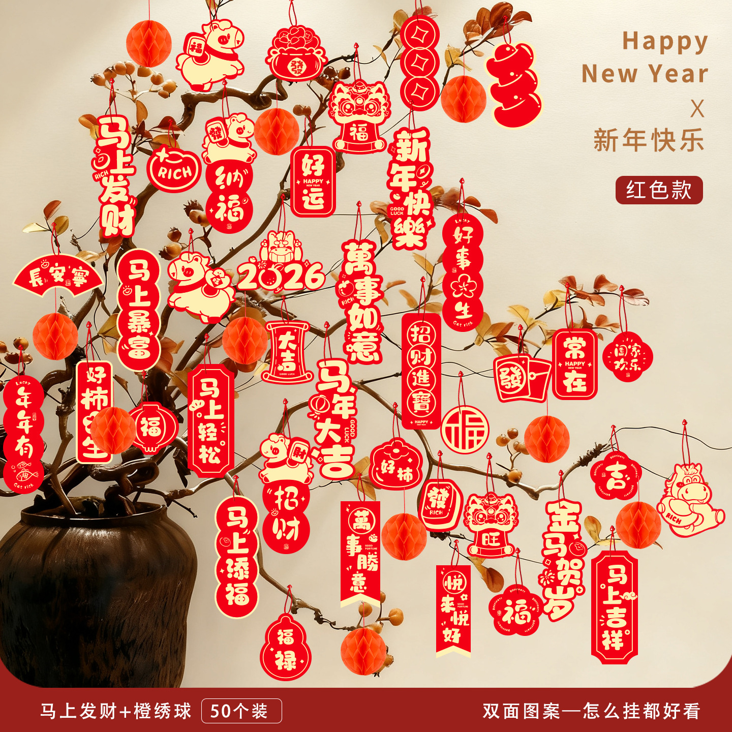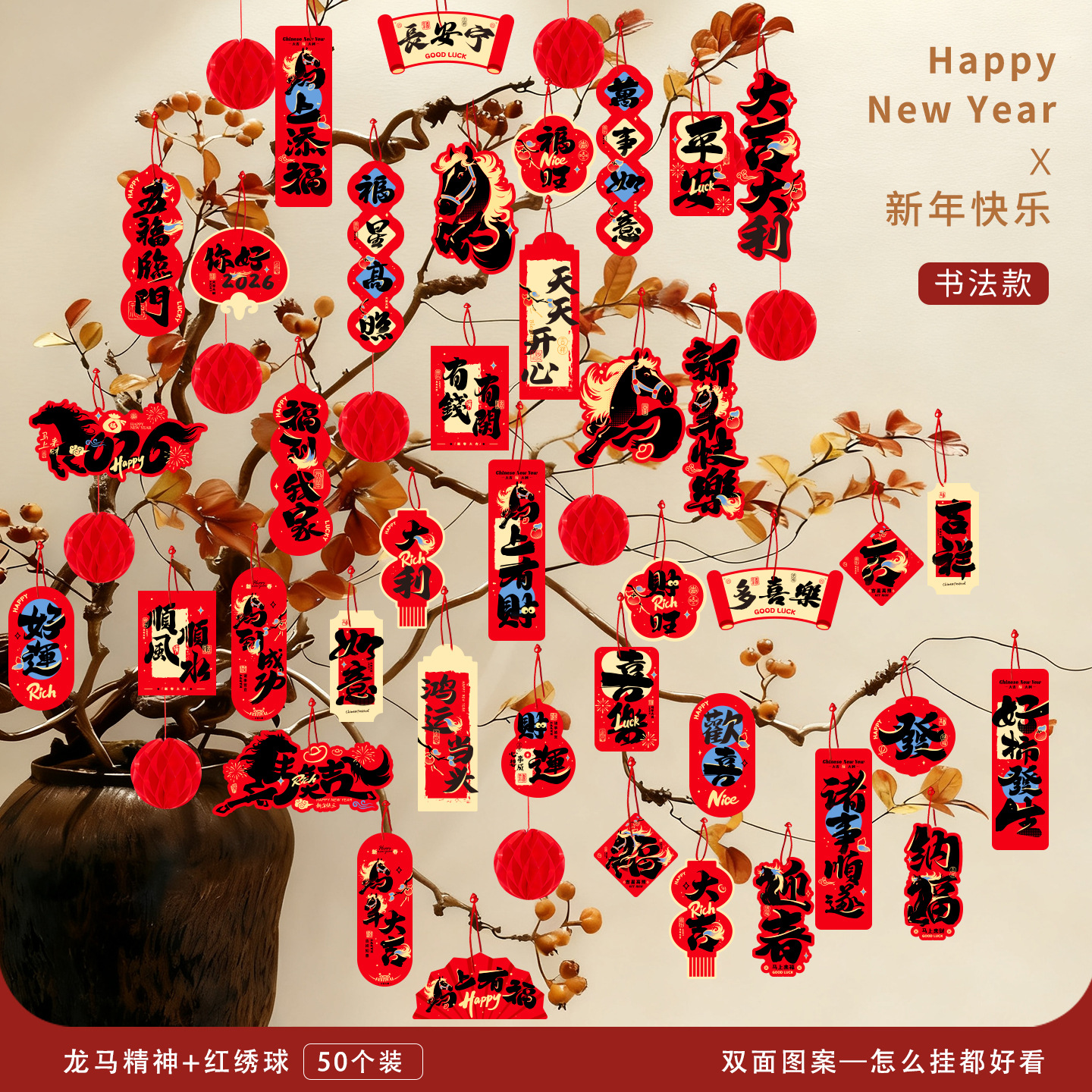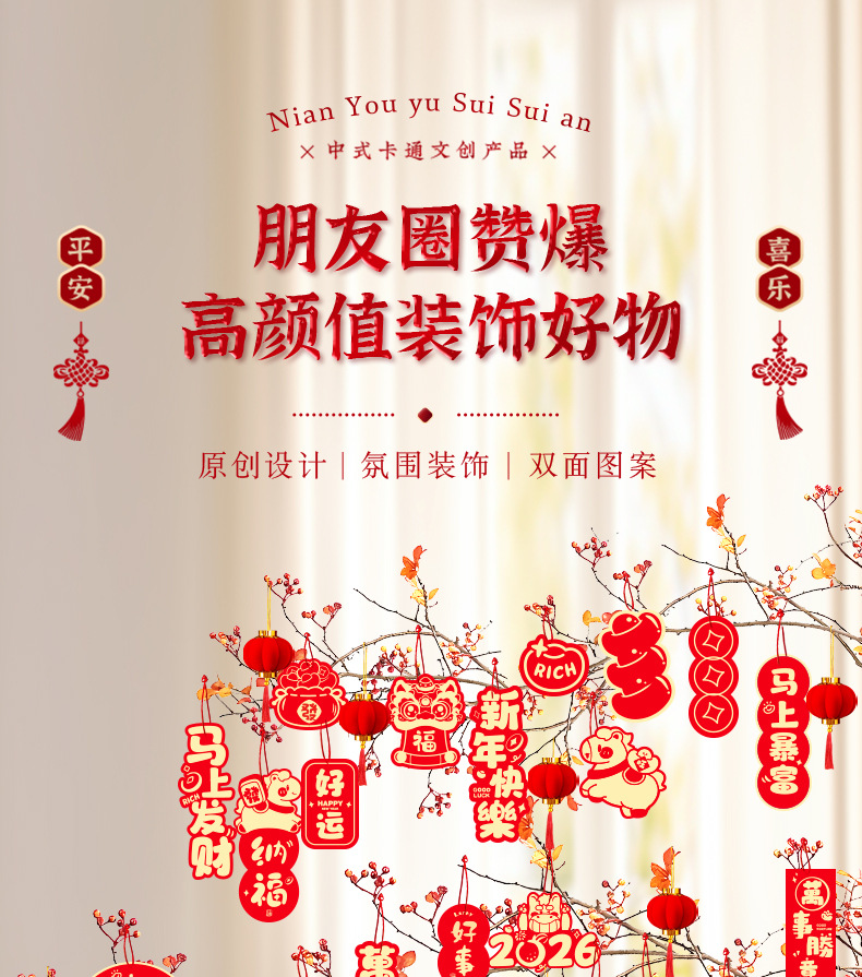 Новогодние украшения 2026 года — Год Лошади: праздничные подвески-бонсай для дома и магазина, настенные декорации с символикой благословения, маленькие подвесные фонарики.