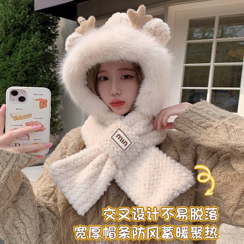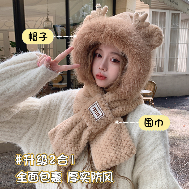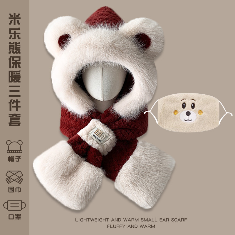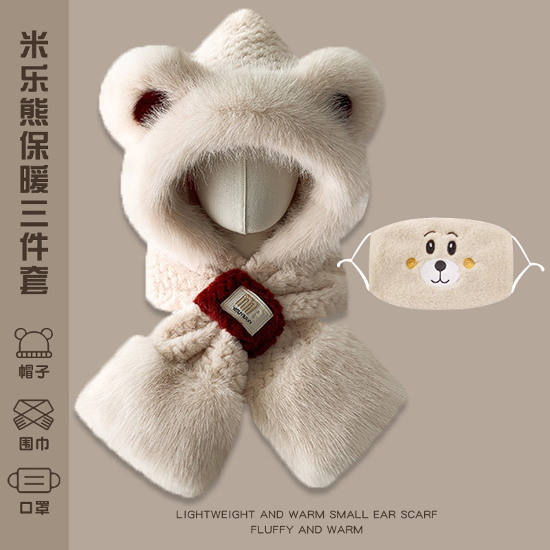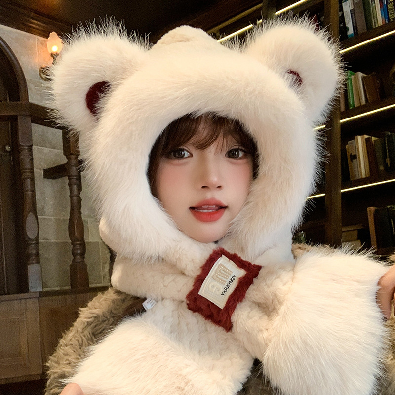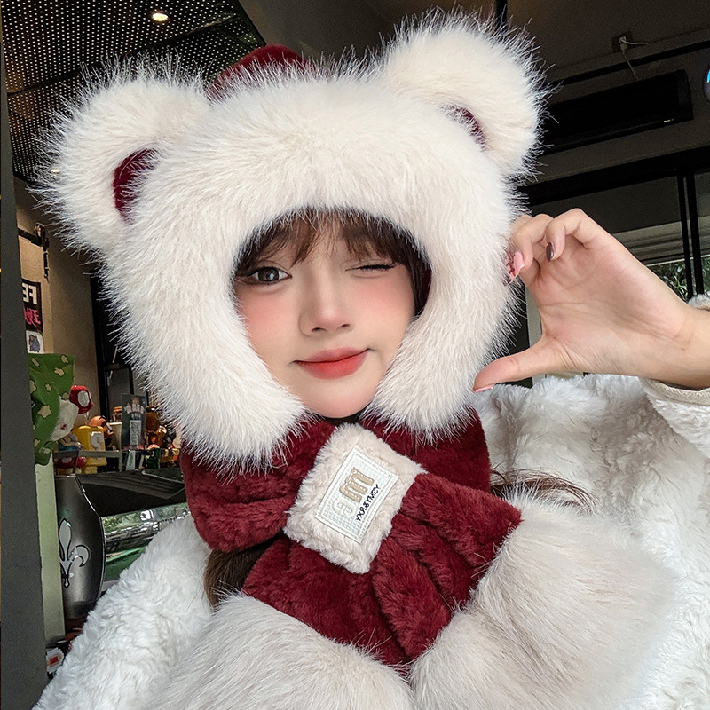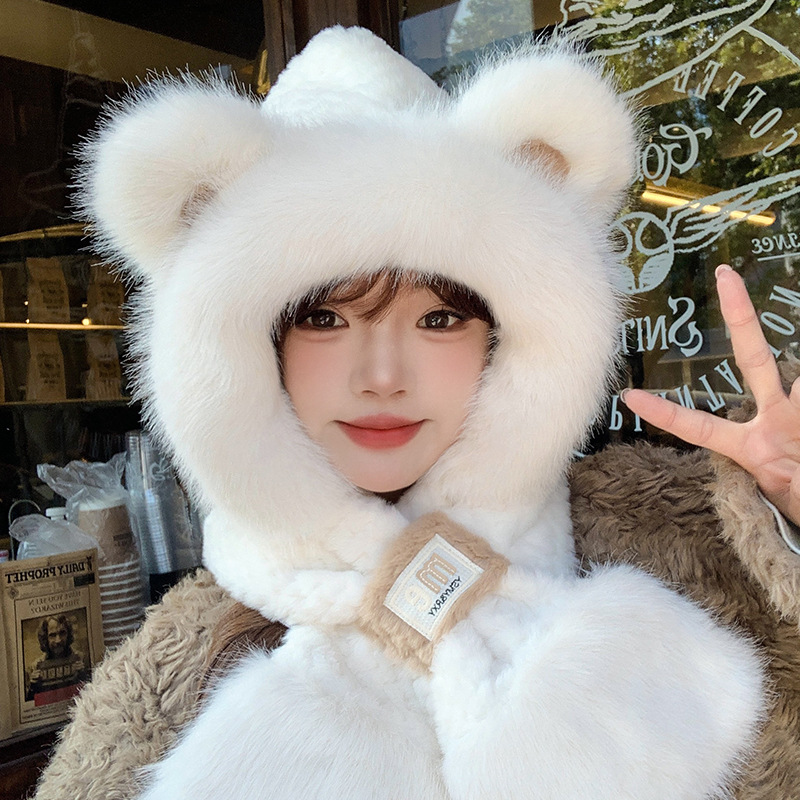 Шапка женская 2025: новая осенне-зимняя модель с интегрированным шарфом, капюшоном, милым медвежонком, утепленная, для велоспорта, с защитой ушей, плюшевая.