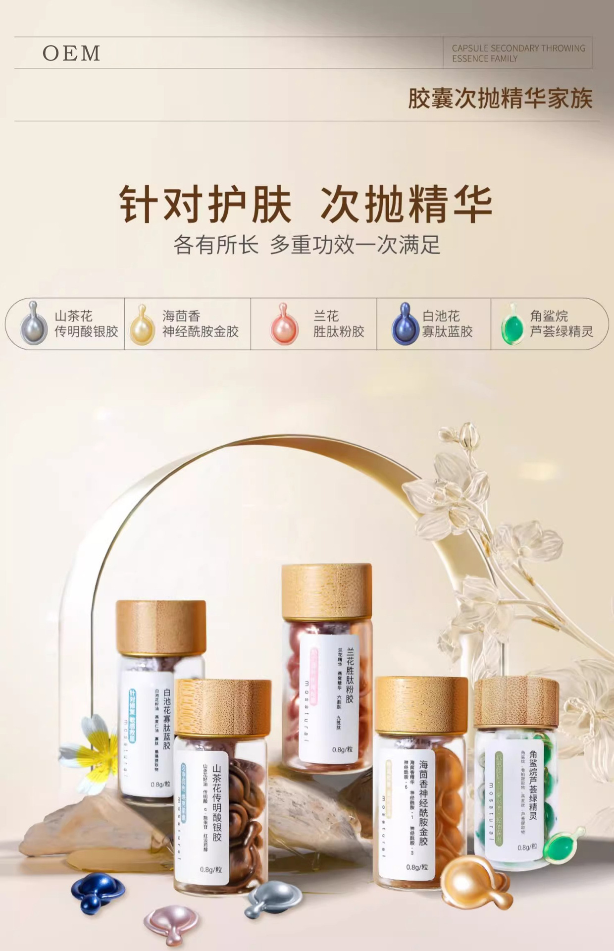 Одноразовые капсулы с эссенцией на заказ (OEM) с пятью цветами и золотым/серебряным гелевым порошком для ухода за кожей, одноразовые капсулы OEM
