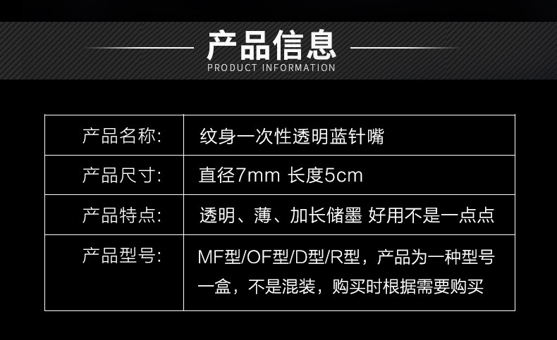 注:DT9一次性透明针嘴,是我司推出的一款纹身针嘴,100%全新料,采用全自动包装机包装,包装精美,安全放心。