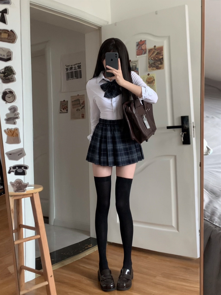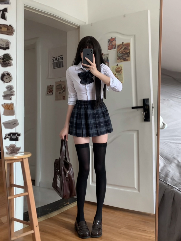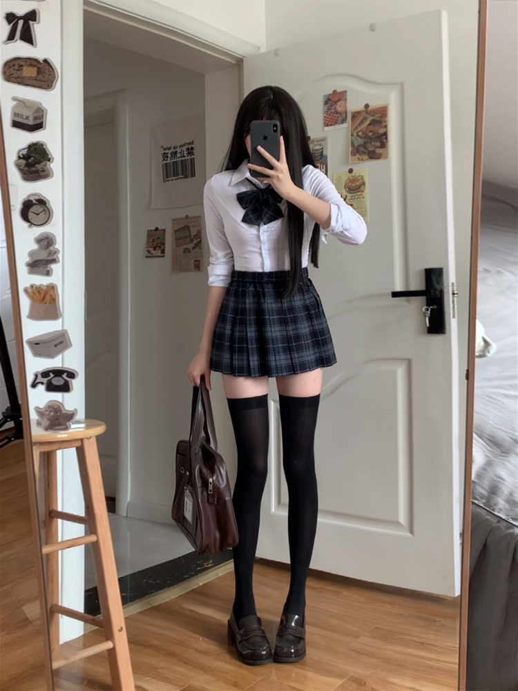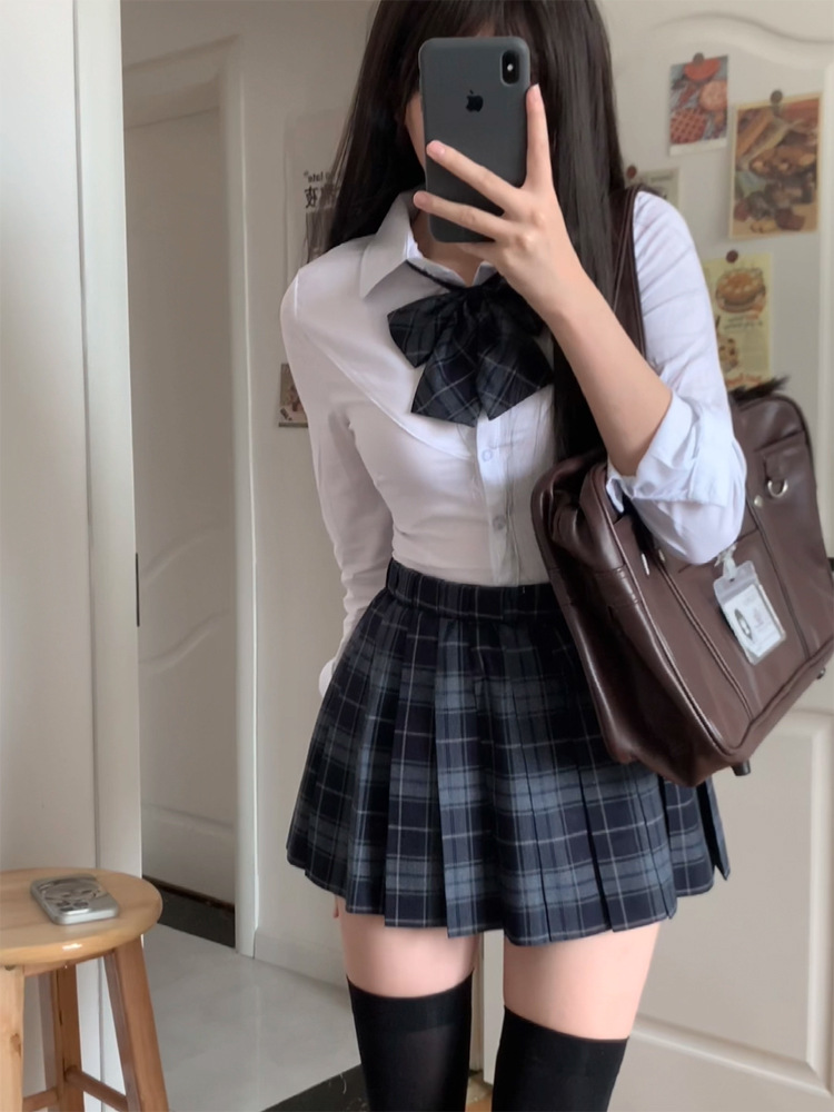 [Shu] Юбка в клетку, одинарная юбка без галстука-бабочки; [Shu] клетчатая юбка + галстук-бабочка того же типа; Рубашка на талииДлинные рукаваТопы; Рубашка на талии с коротким рукавом, один топ