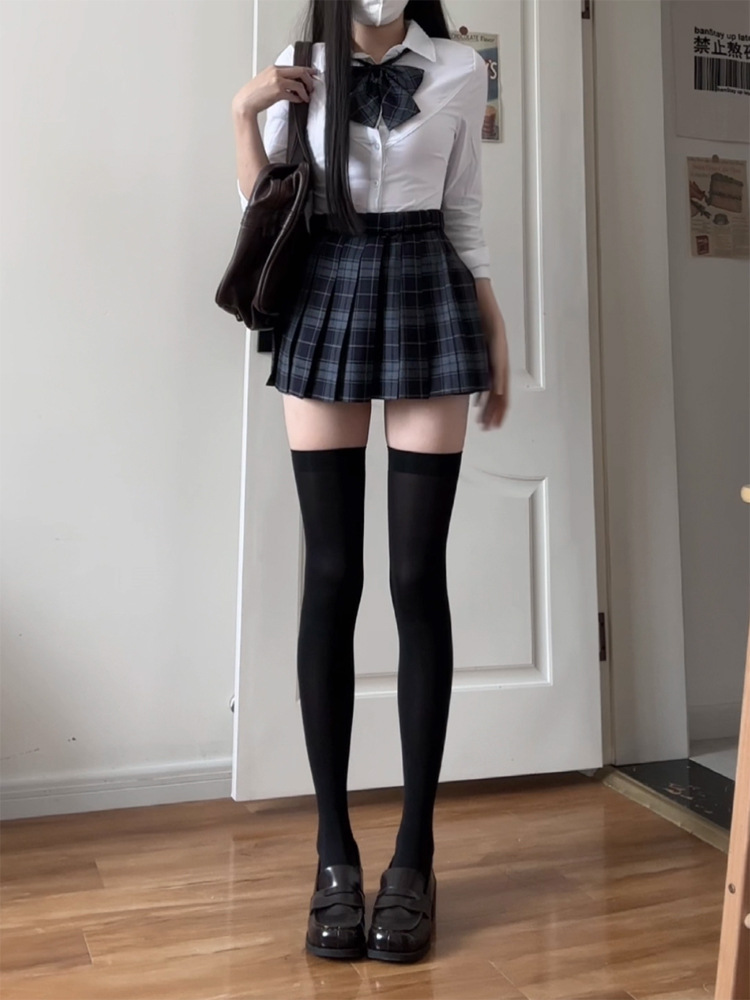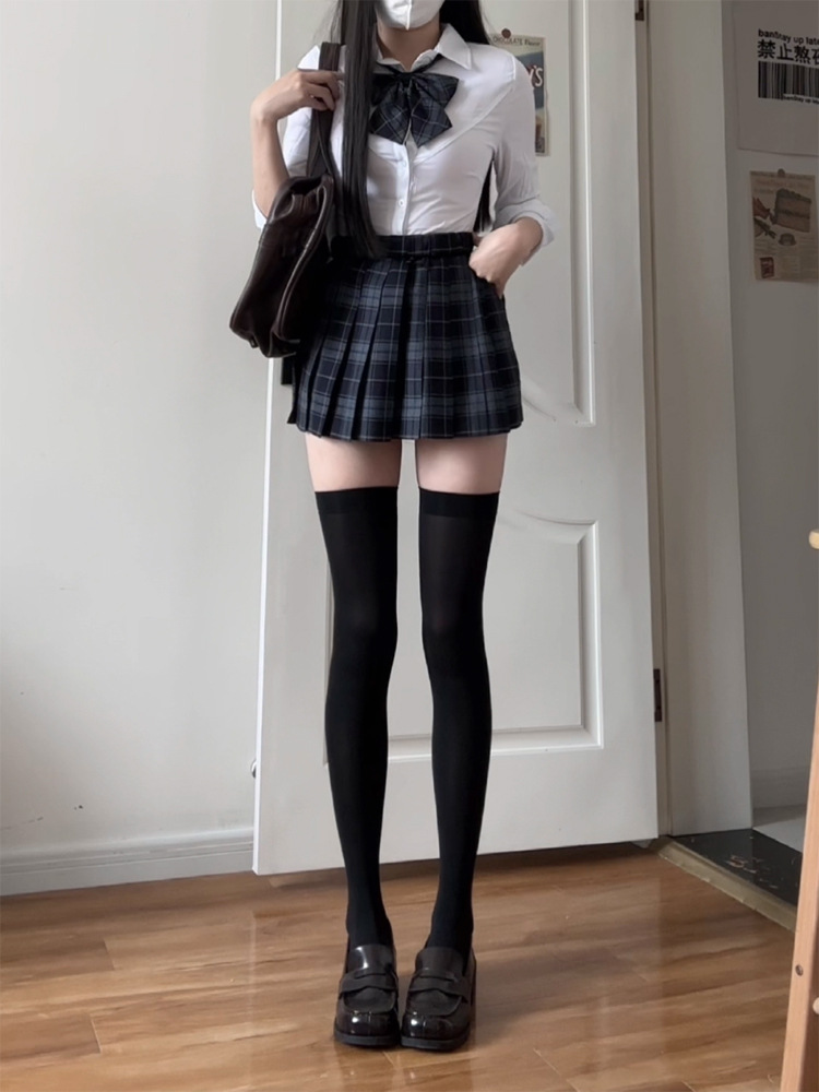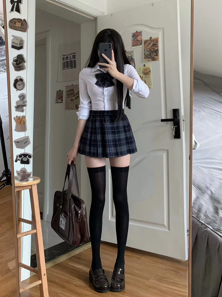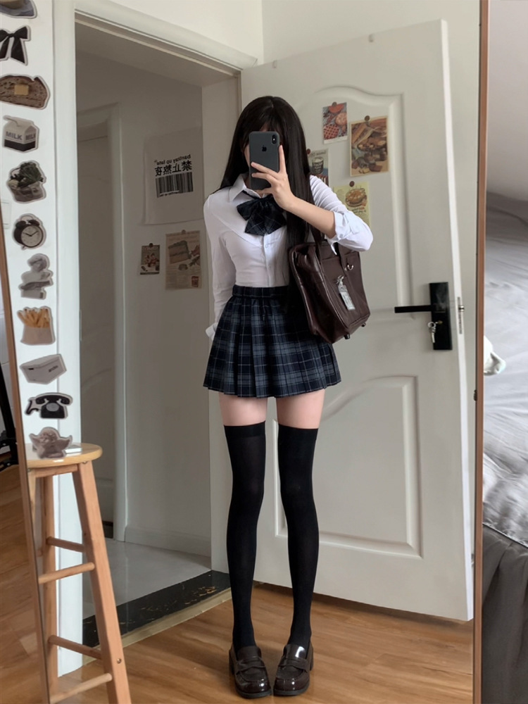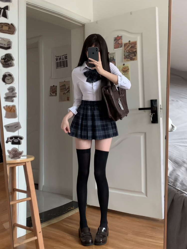 [Shu] Юбка в клетку, одинарная юбка без галстука-бабочки; [Shu] клетчатая юбка + галстук-бабочка того же типа; Рубашка на талииДлинные рукаваТопы; Рубашка на талии с коротким рукавом, один топ